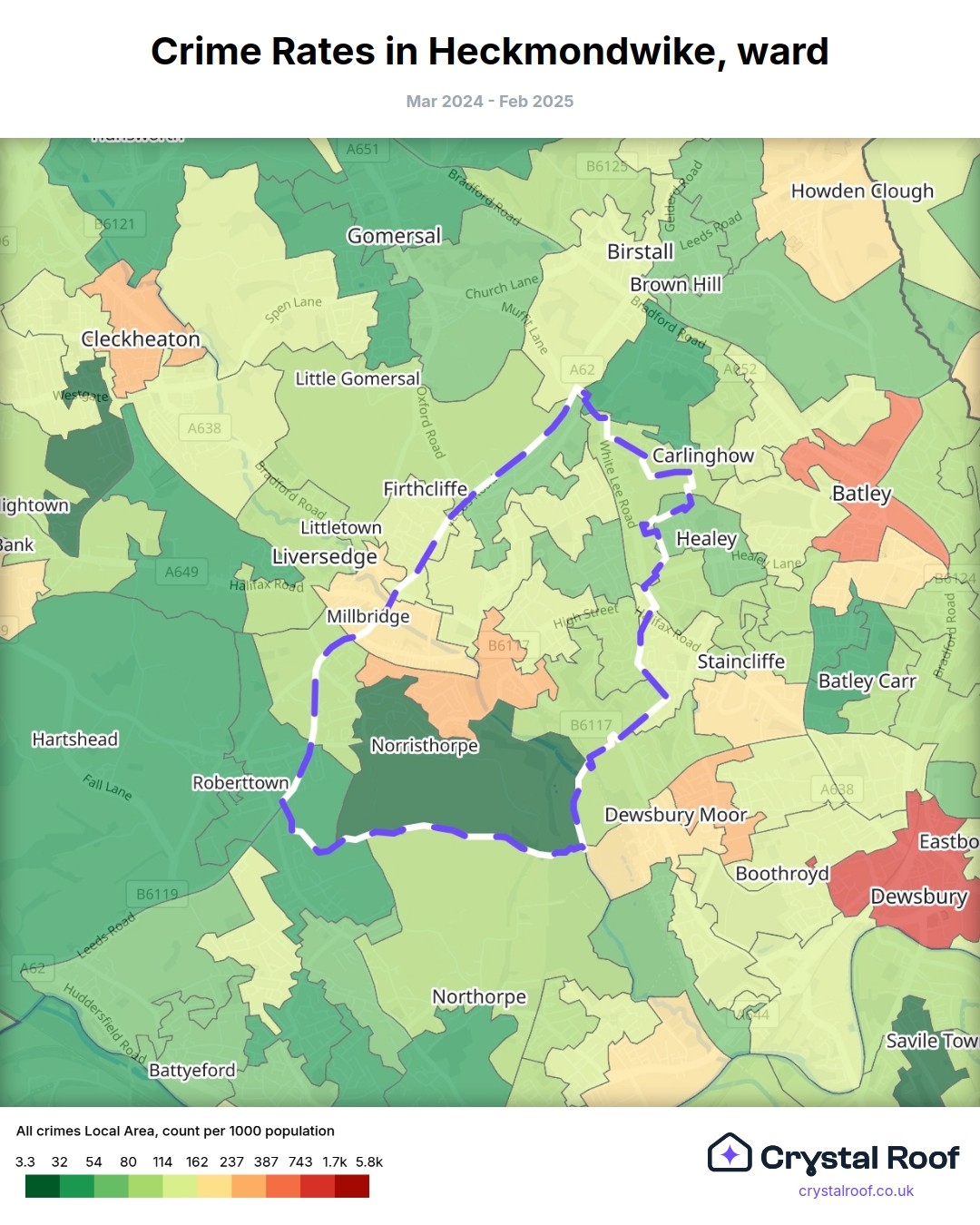 Heckmondwike, (ward) includes areas with the following crime ratings (see map):