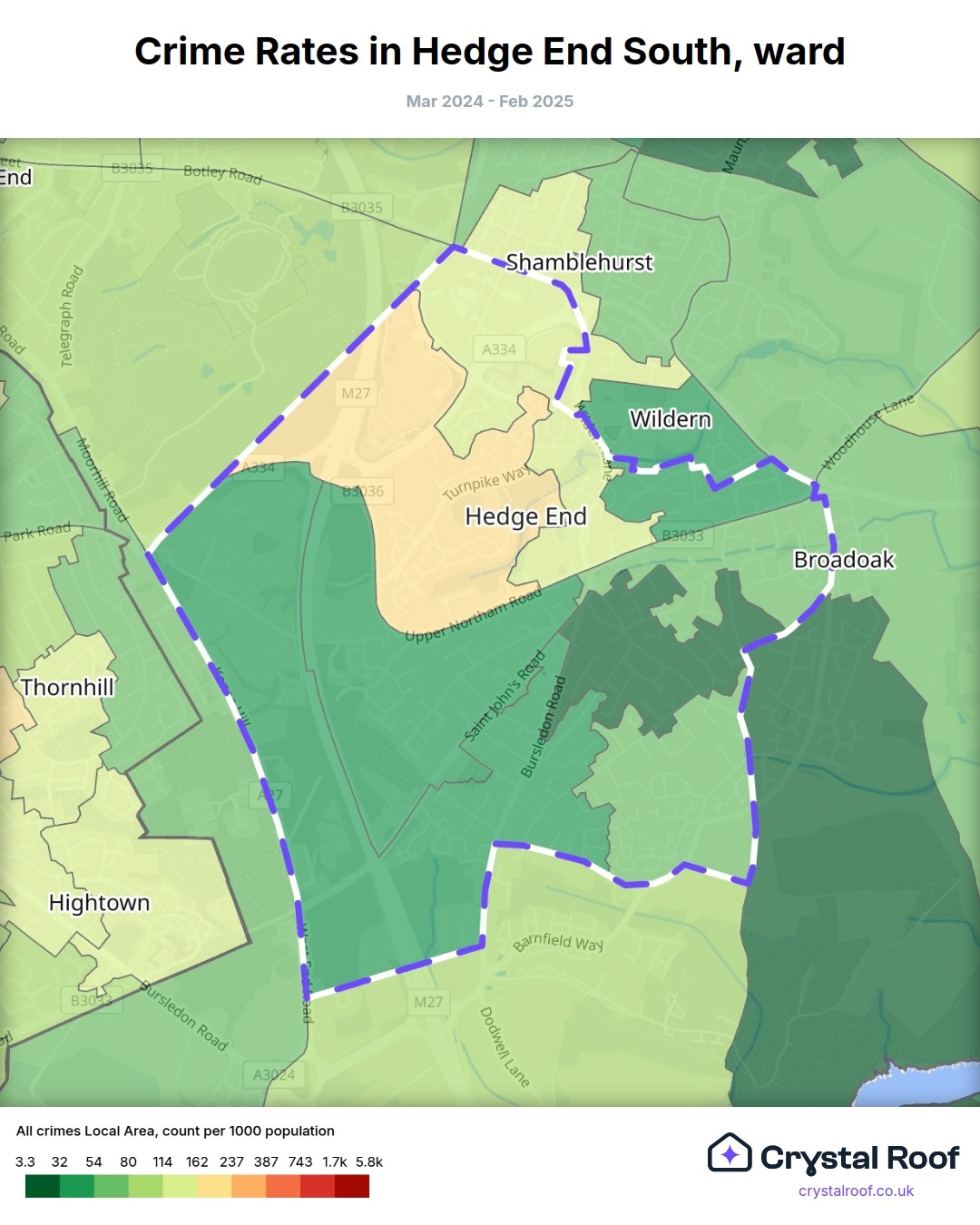 Hedge End South, (ward) includes areas with the following crime ratings (see map):