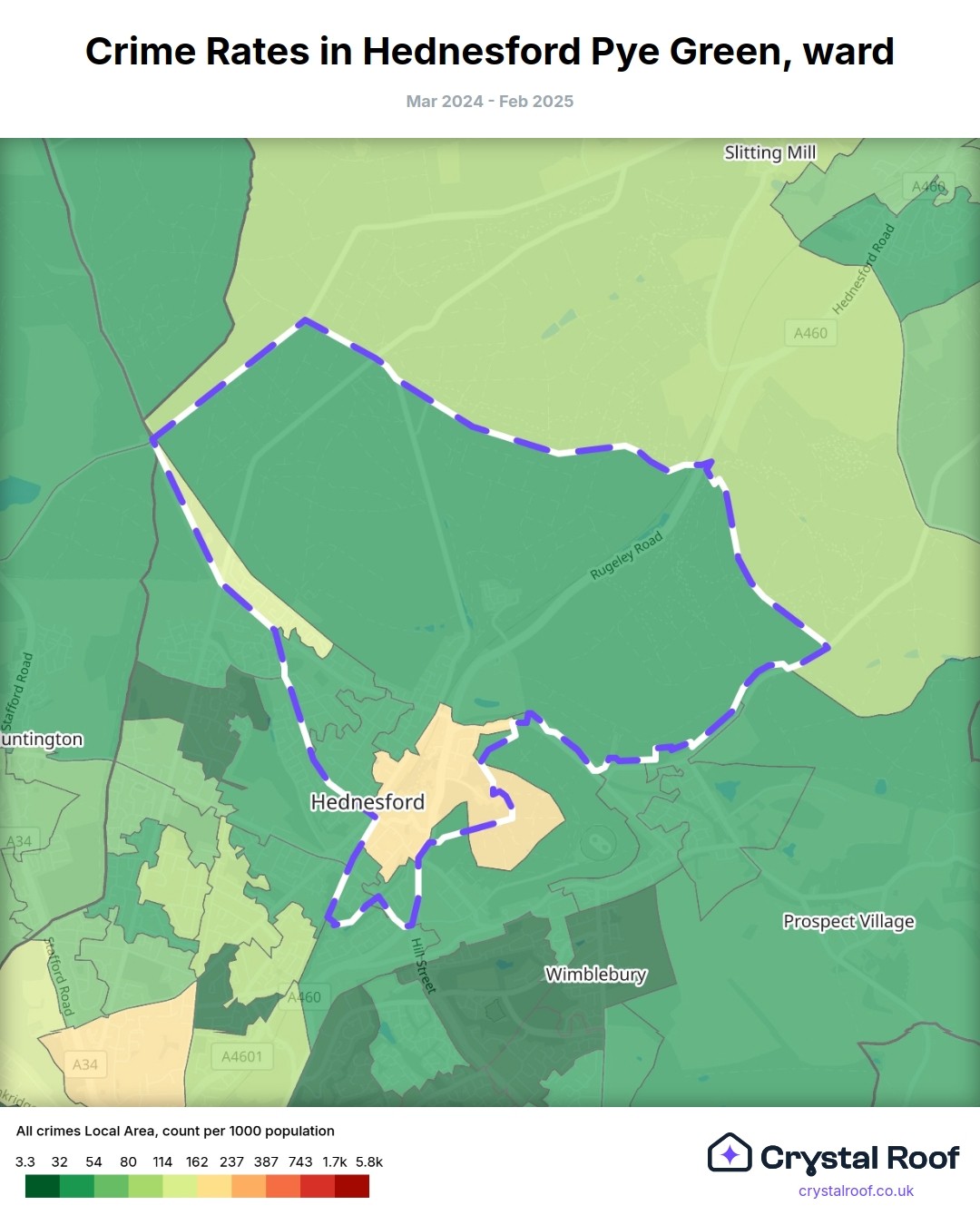 The figures in grey indicate the relative ratings of Hednesford Pye Green (ward) for a specific crime type compared to other wards in England and Wales.