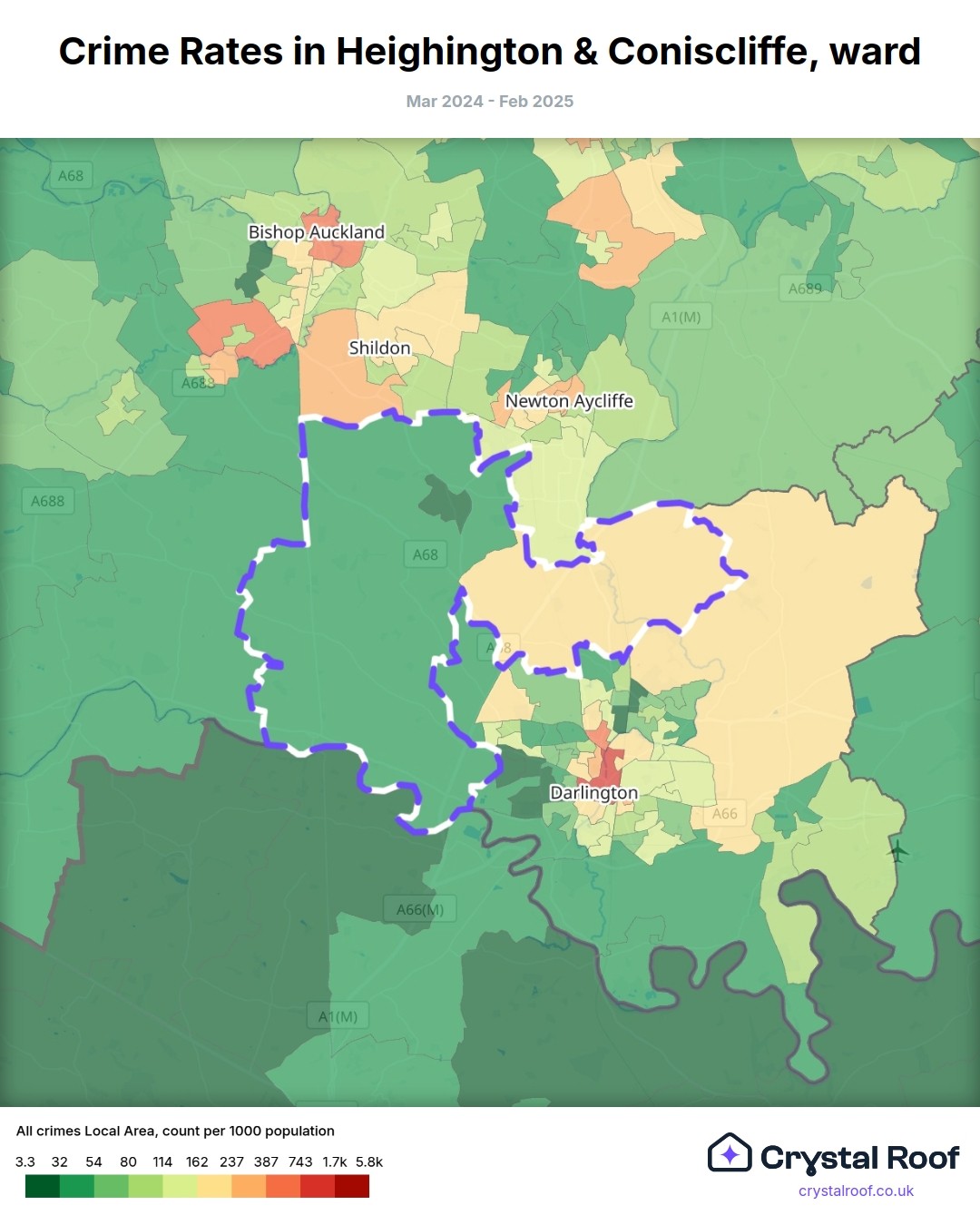 Heighington & Coniscliffe, (ward) includes areas with the following crime ratings (see map):