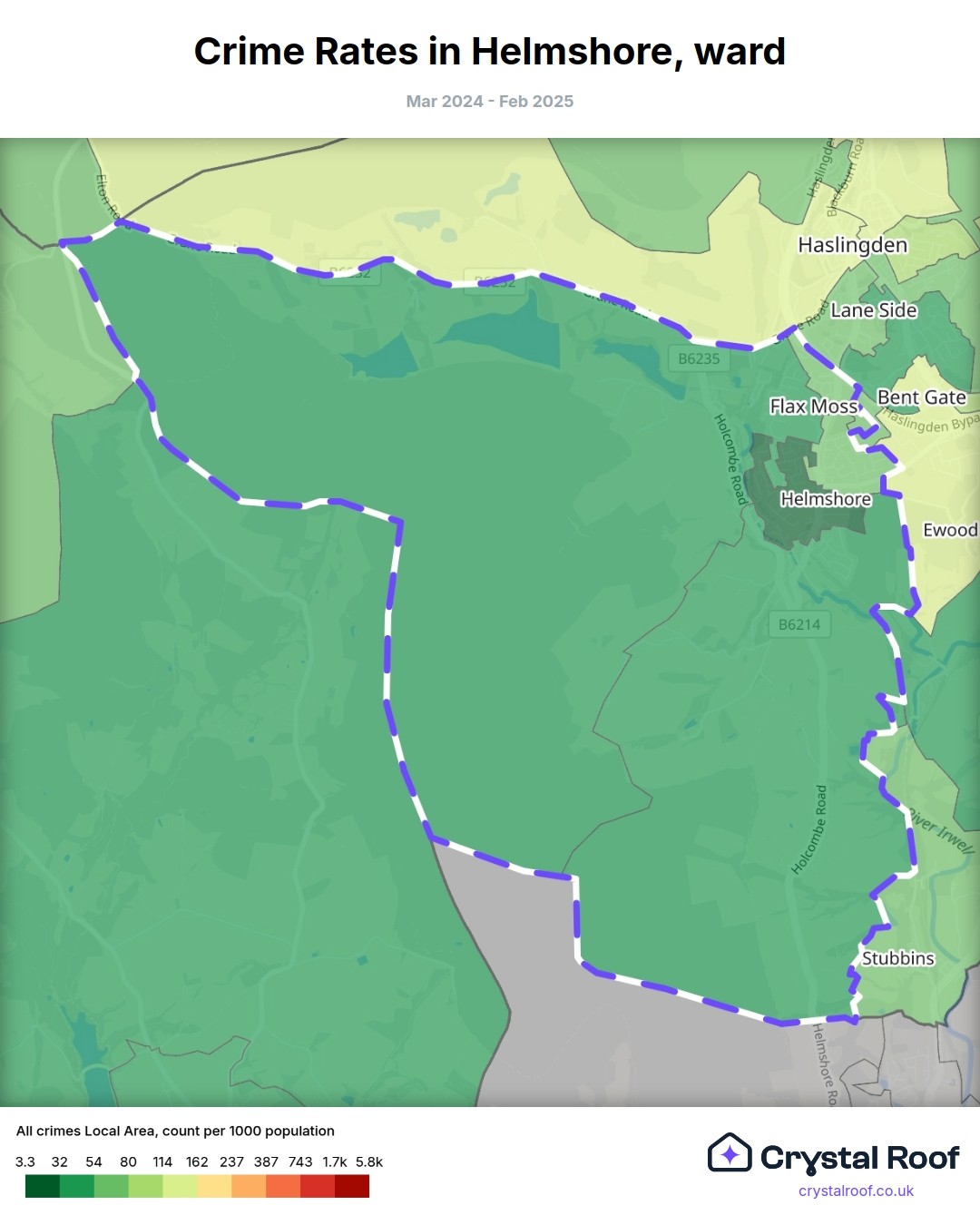 Helmshore, (ward) includes areas with the following crime ratings (see map):