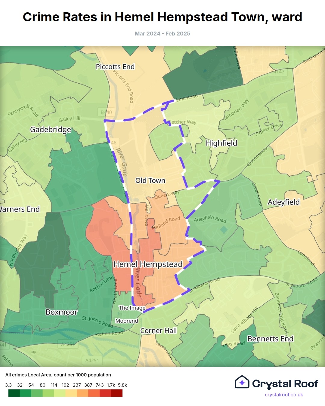 Hemel Hempstead Town, (ward) includes areas with the following crime ratings (see map):