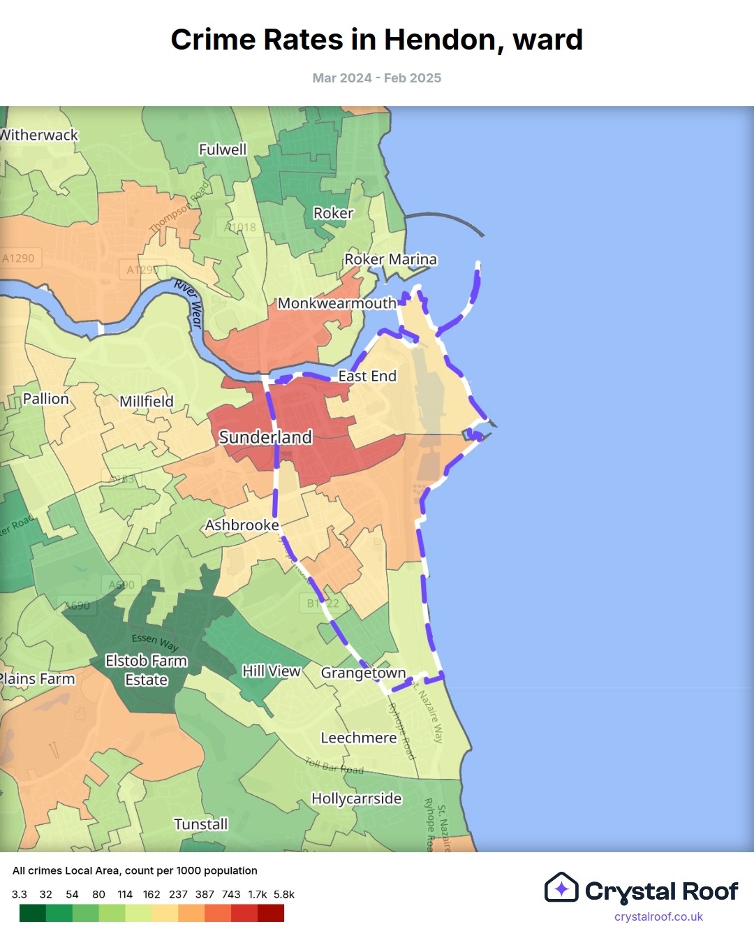 Hendon (ward) is located within Sunderland (borough). Annual total crime rate in Sunderland (borough) is 122 crimes per thousand resident population, which can be rated as 6 out of 10 or medium crime level compared to other local authority districts in England and Wales.