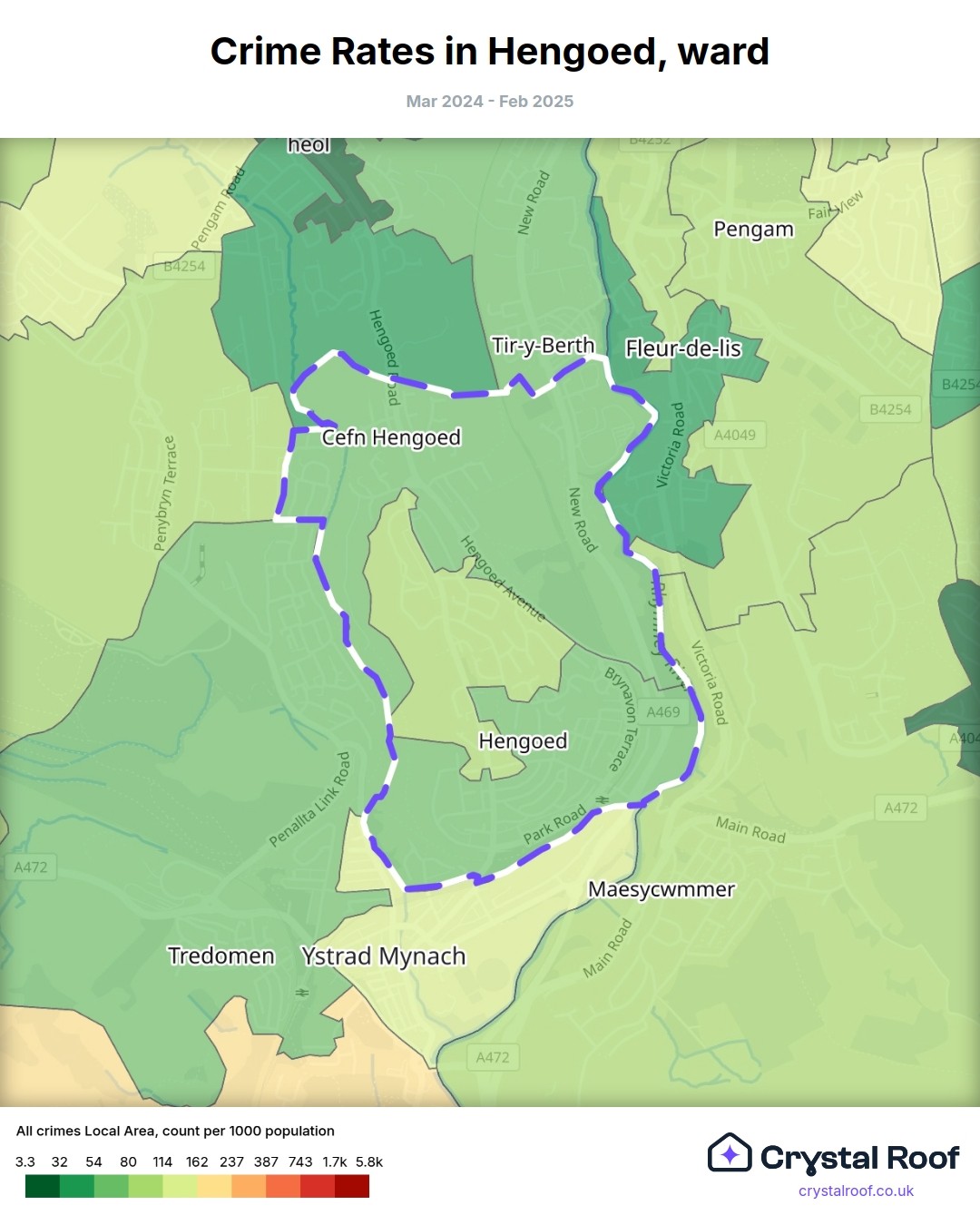 Hengoed, (ward) includes areas with the following crime ratings (see map):