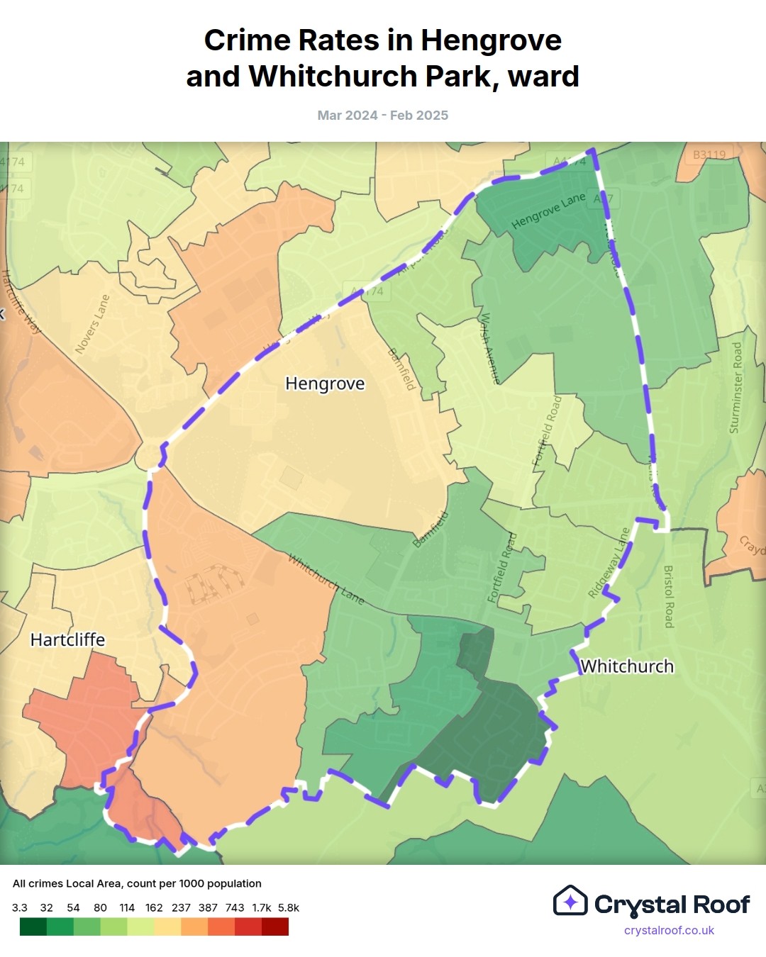 Hengrove and Whitchurch Park, (ward) includes areas with the following crime ratings (see map):