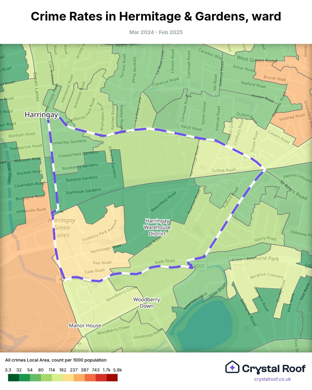 Hermitage & Gardens (ward) is located within Haringey (borough). Annual total crime rate in Haringey (borough) is 138 crimes per thousand resident population, which can be rated as 7 out of 10 or high crime level compared to other local authority districts in England and Wales.