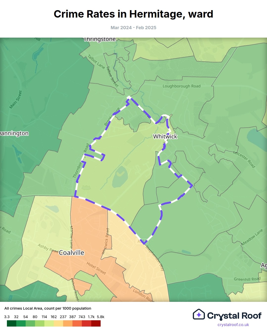 Hermitage (ward) is located within North West Leicestershire (borough). Annual total crime rate in North West Leicestershire (borough) is 78.6 crimes per thousand resident population, which can be rated as 3 out of 10 or low crime level compared to other local authority districts in England and Wales.