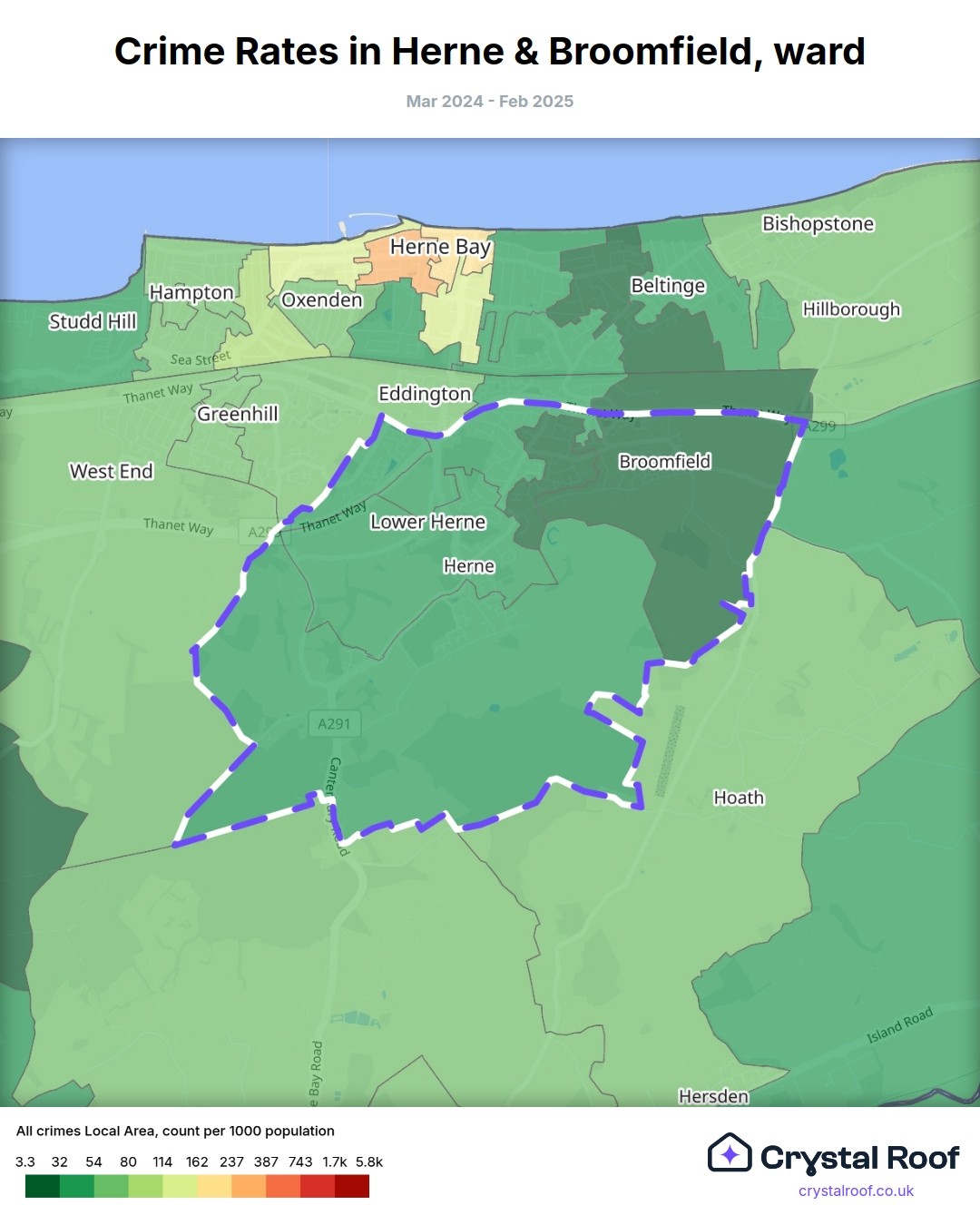 Herne & Broomfield, (ward) includes areas with the following crime ratings (see map):