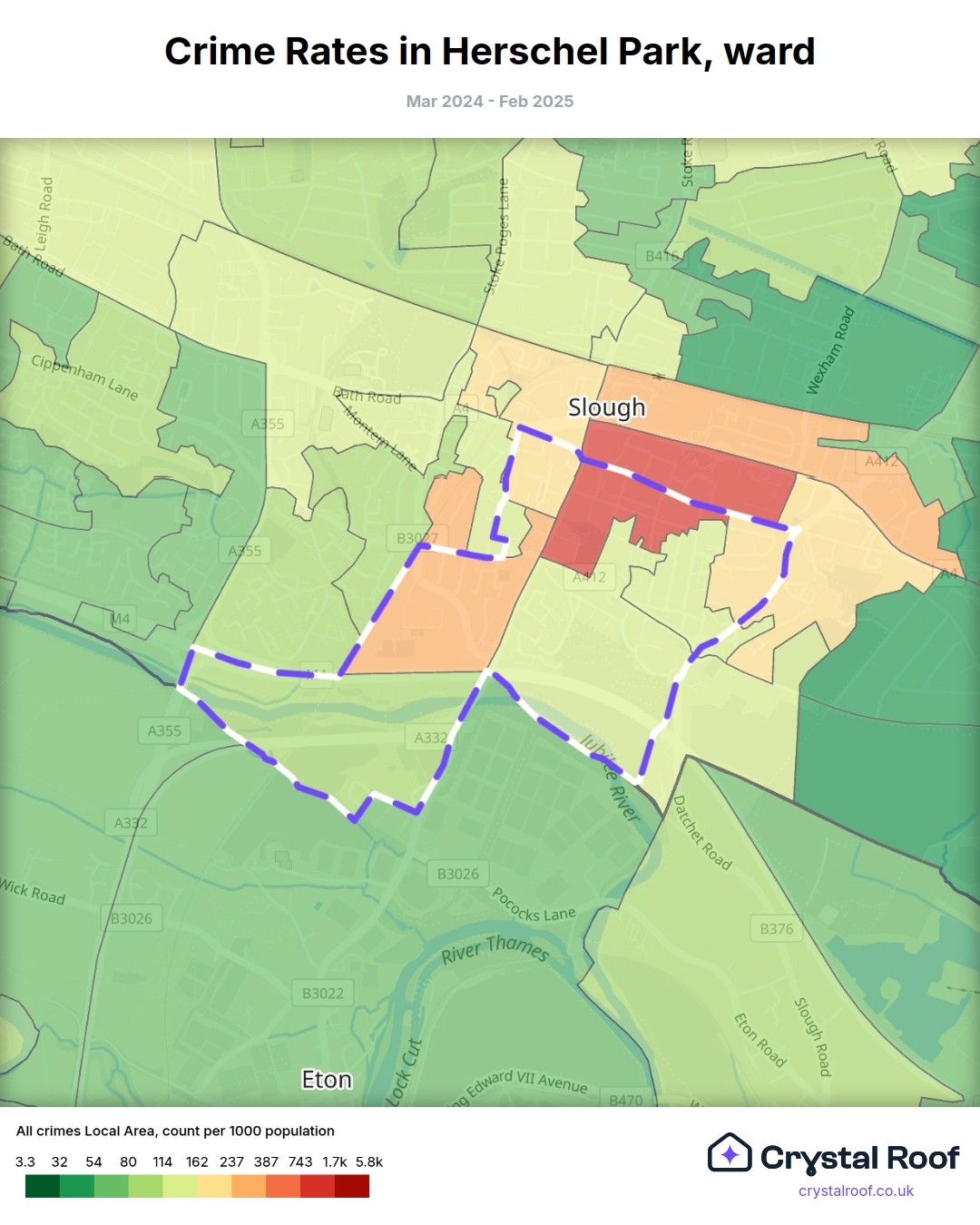 Herschel Park (ward) is located within Slough (borough). Annual total crime rate in Slough (borough) is 103 crimes per thousand resident population, which can be rated as 5 out of 10 or medium crime level compared to other local authority districts in England and Wales.