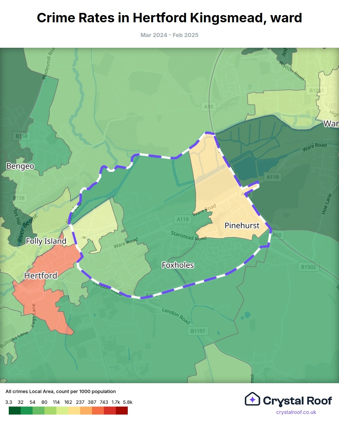 Hertford Kingsmead, (ward) includes areas with the following crime ratings (see map):