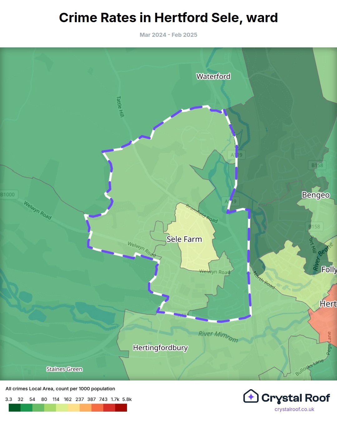 Hertford Sele, (ward) includes areas with the following crime ratings (see map):