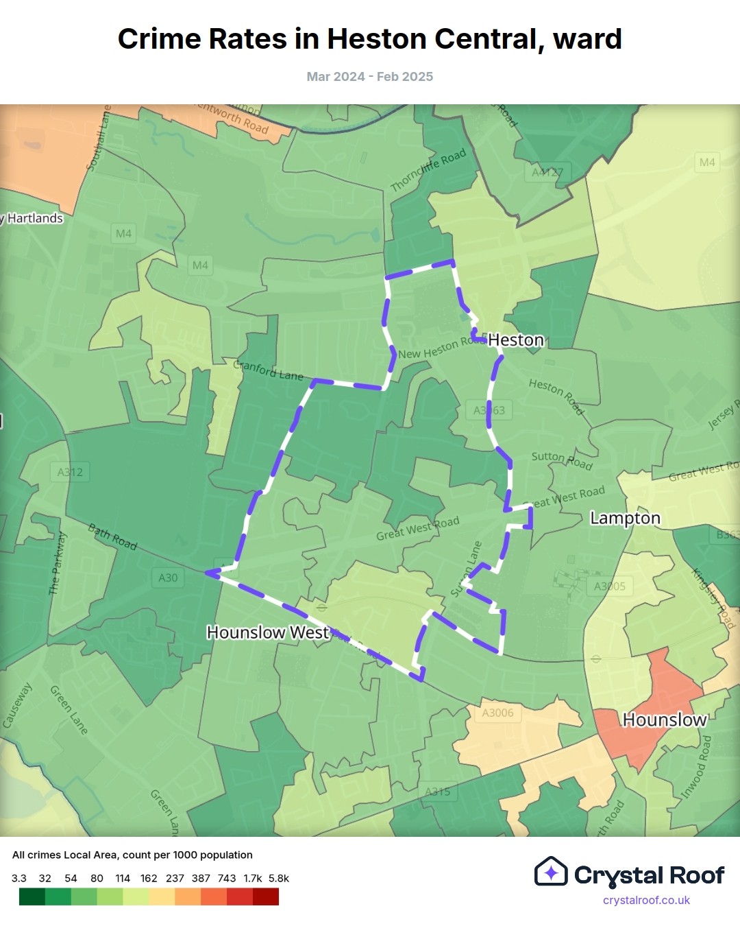 Heston Central, (ward) includes areas with the following crime ratings (see map):