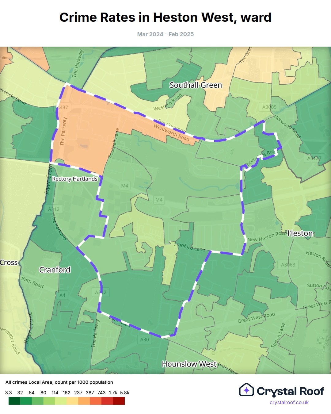 Heston West, (ward) includes areas with the following crime ratings (see map):