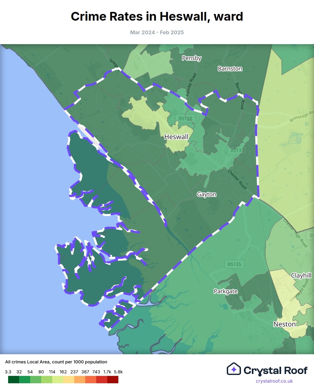 Heswall, (ward) includes areas with the following crime ratings (see map):