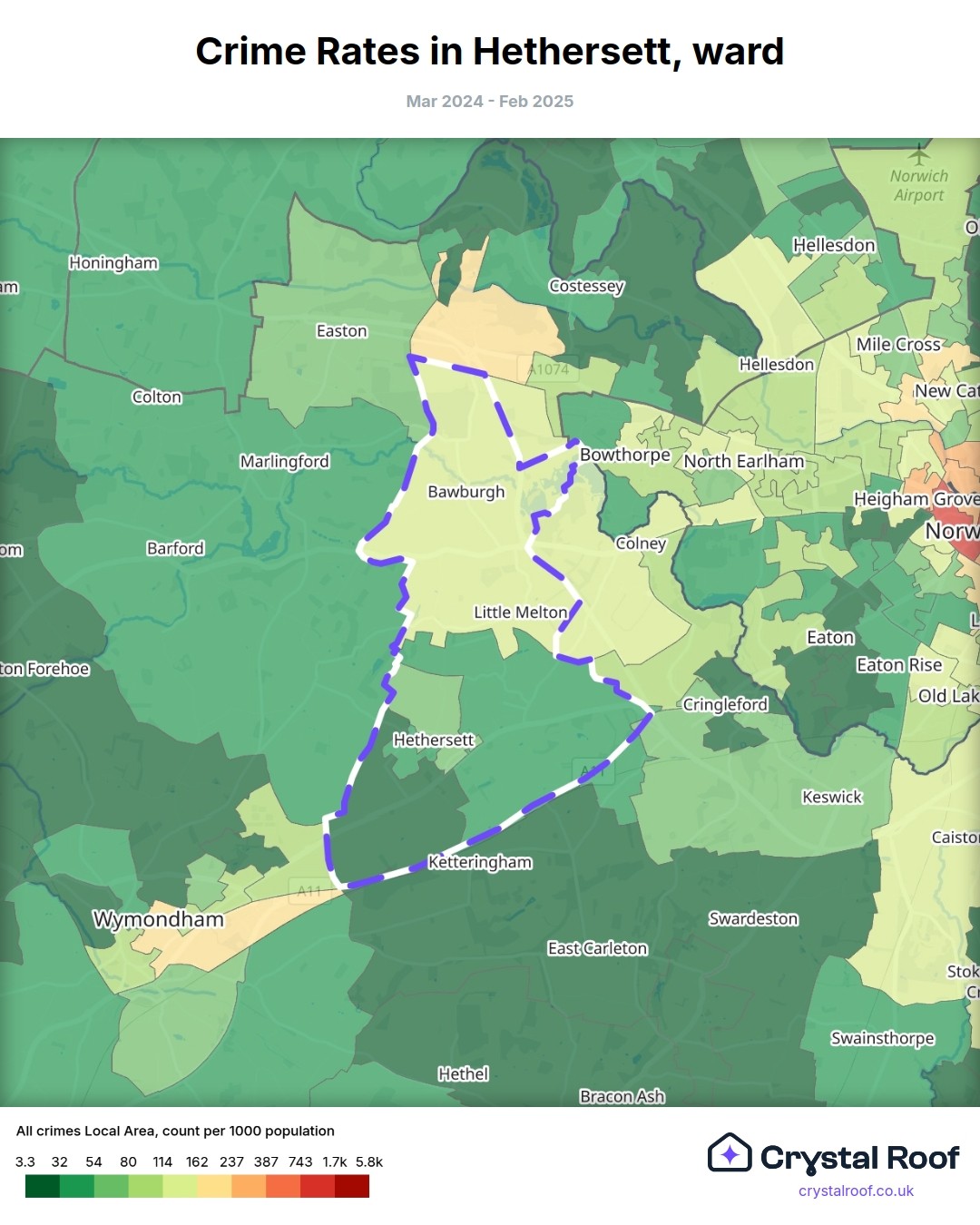 Hethersett, (ward) includes areas with the following crime ratings (see map):