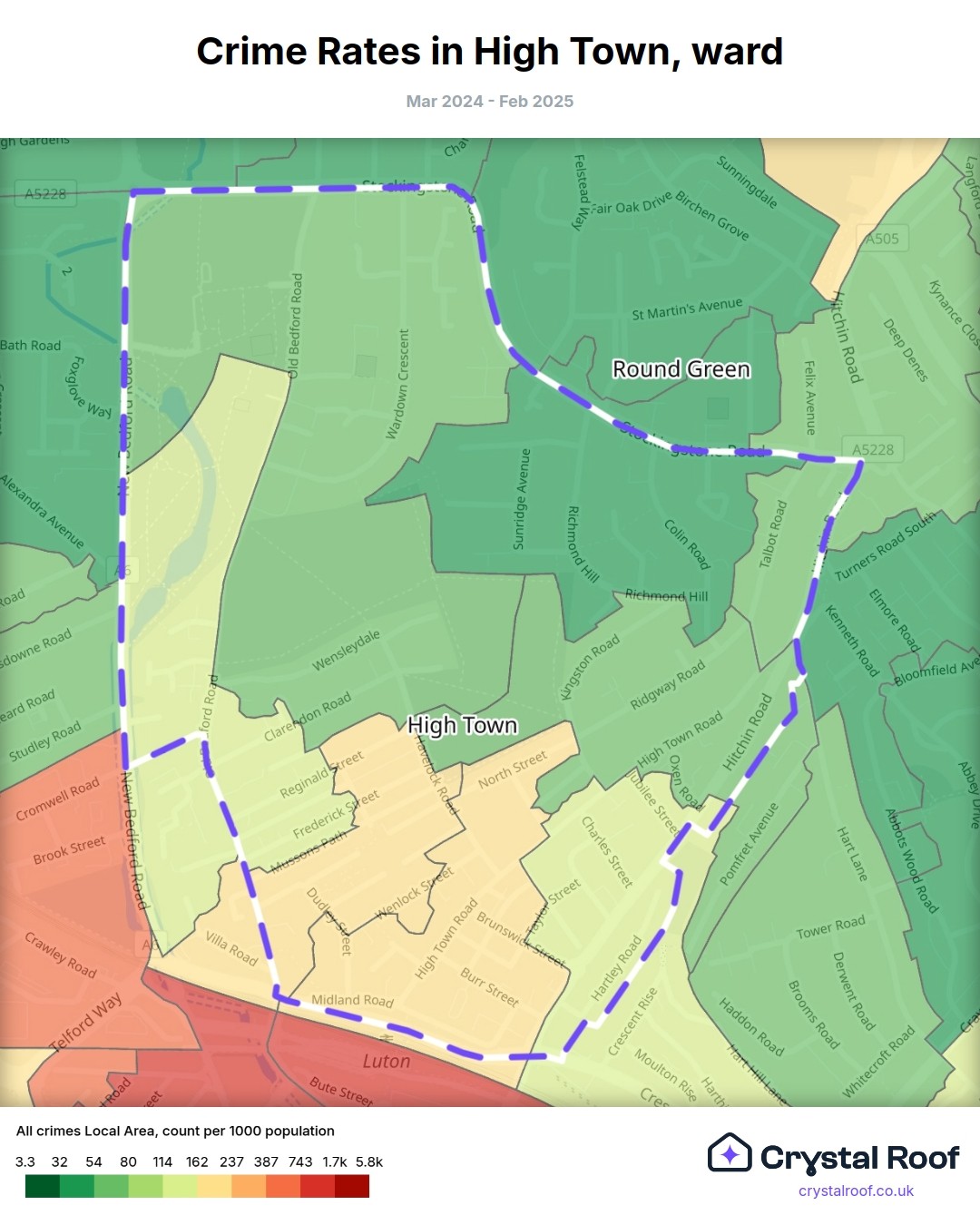 High Town (ward) is located within Luton (borough). Annual total crime rate in Luton (borough) is 101 crimes per thousand resident population, which can be rated as 4 out of 10 or low crime level compared to other local authority districts in England and Wales.