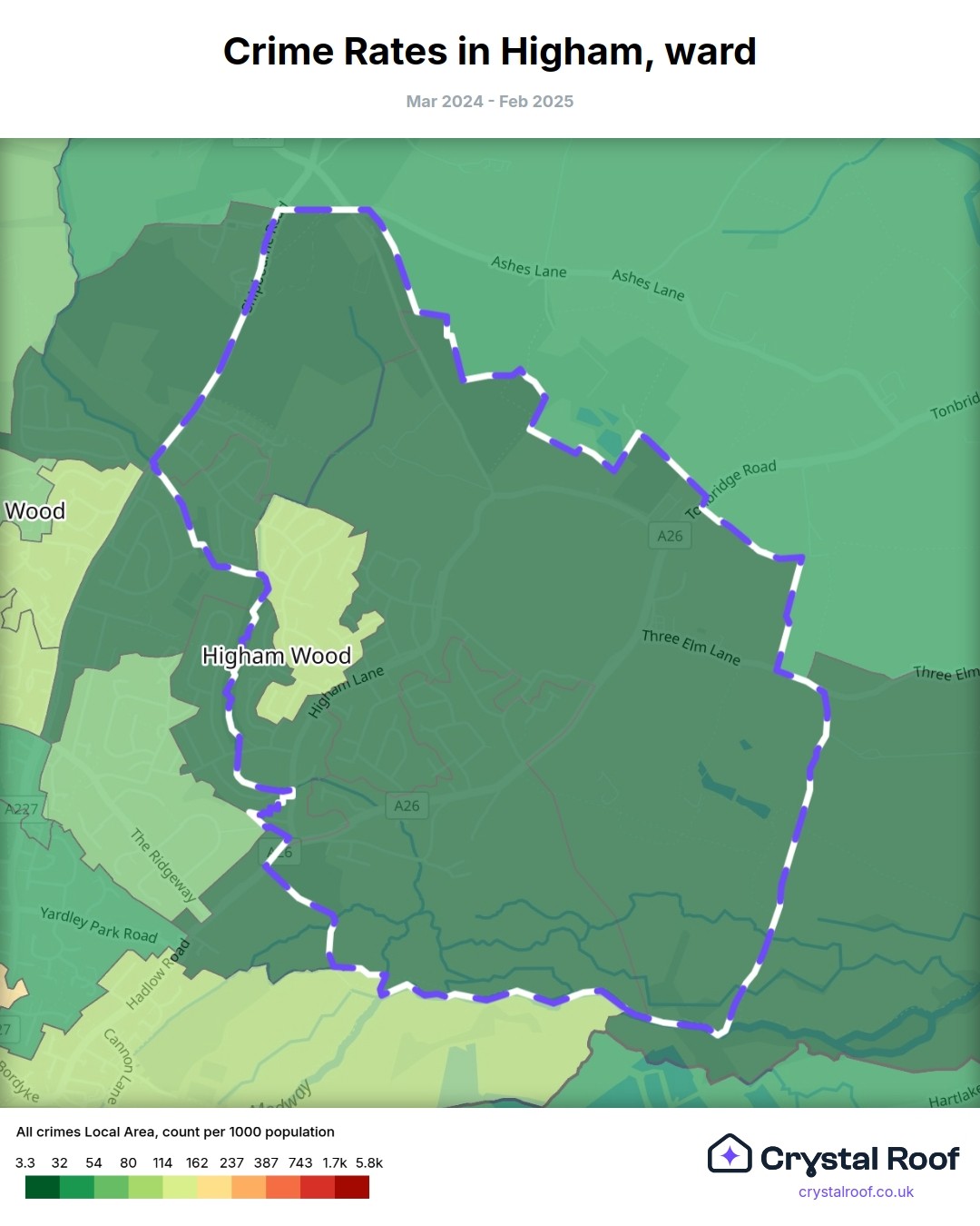 Higham (ward) is located within Tonbridge and Malling (borough). Annual total crime rate in Tonbridge and Malling (borough) is 69 crimes per thousand resident population, which can be rated as 2 out of 10 or low crime level compared to other local authority districts in England and Wales.