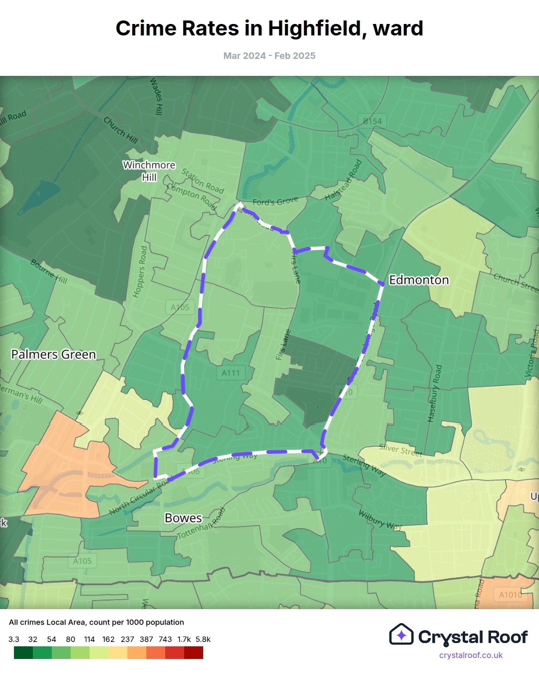 Highfield (ward) is located within Enfield (borough). Annual total crime rate in Enfield (borough) is 113 crimes per thousand resident population, which can be rated as 5 out of 10 or medium crime level compared to other local authority districts in England and Wales.