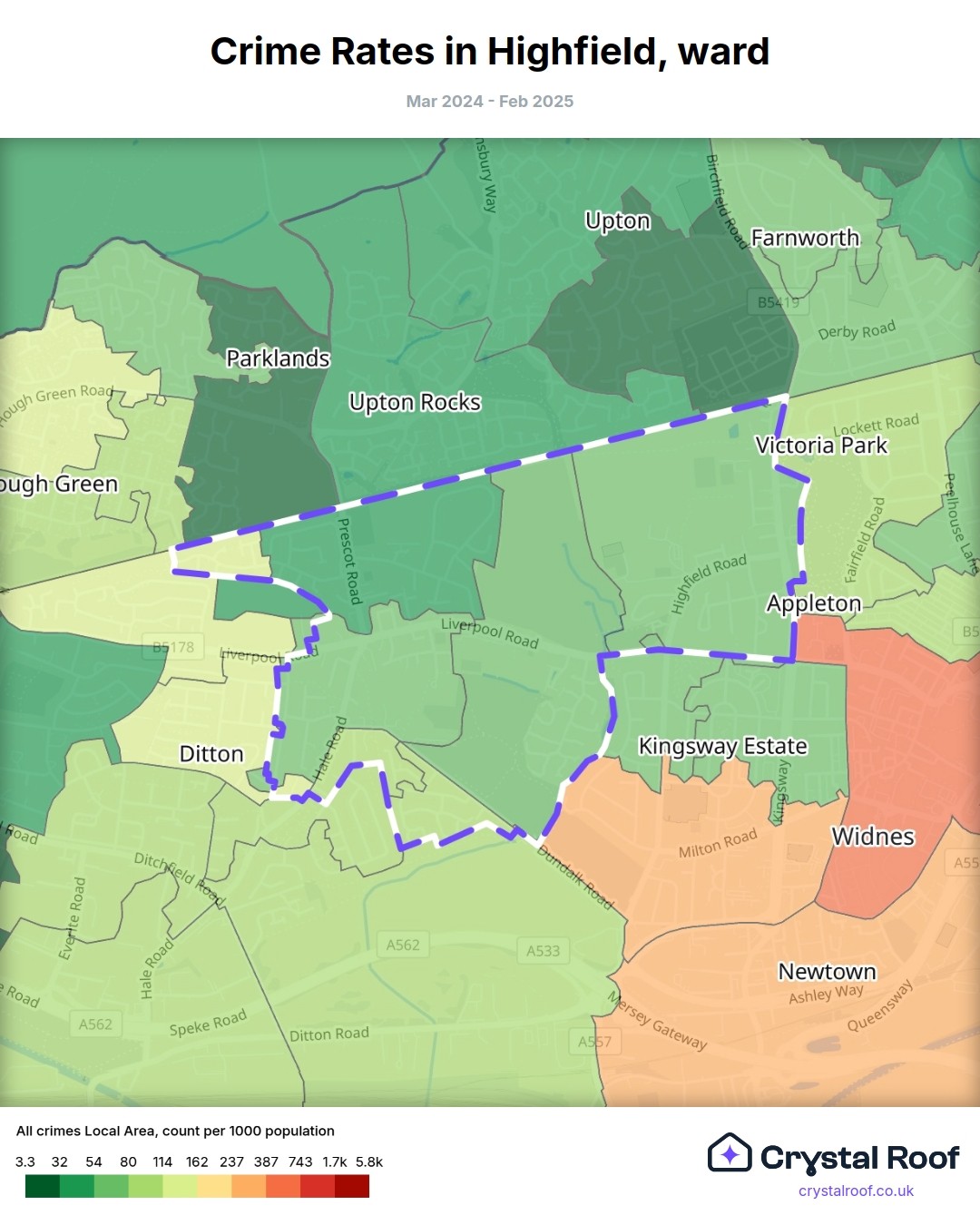 Highfield (ward) is located within Halton (borough). Annual total crime rate in Halton (borough) is 91.4 crimes per thousand resident population, which can be rated as 4 out of 10 or low crime level compared to other local authority districts in England and Wales.