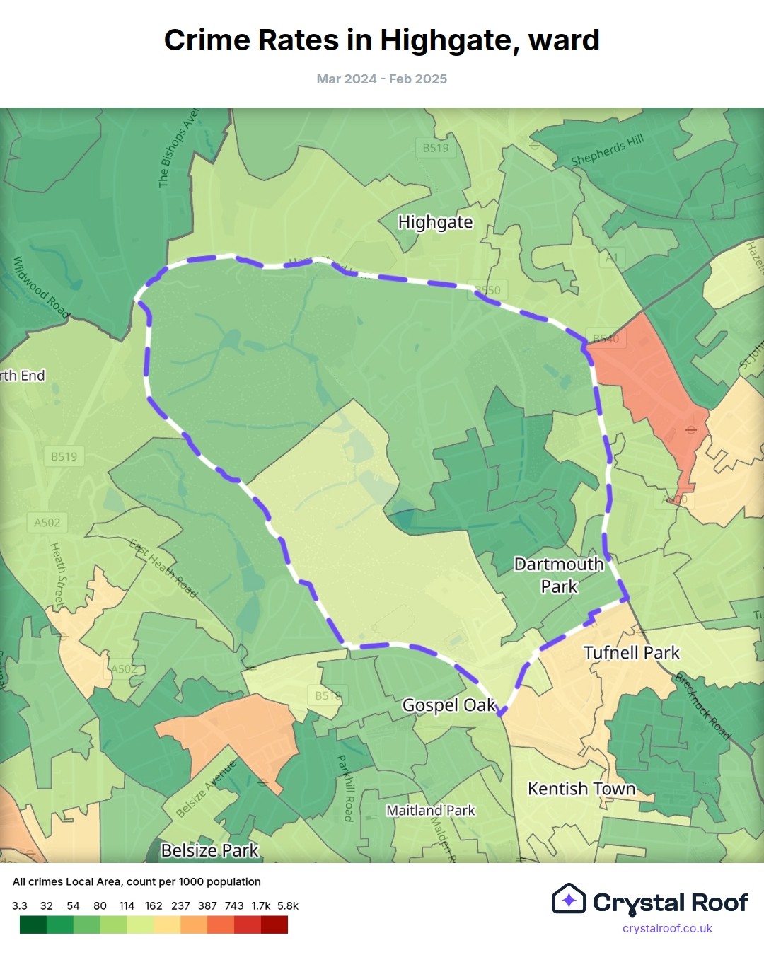The figures in grey indicate the relative ratings of Highgate (ward) for a specific crime type compared to other wards in England and Wales.