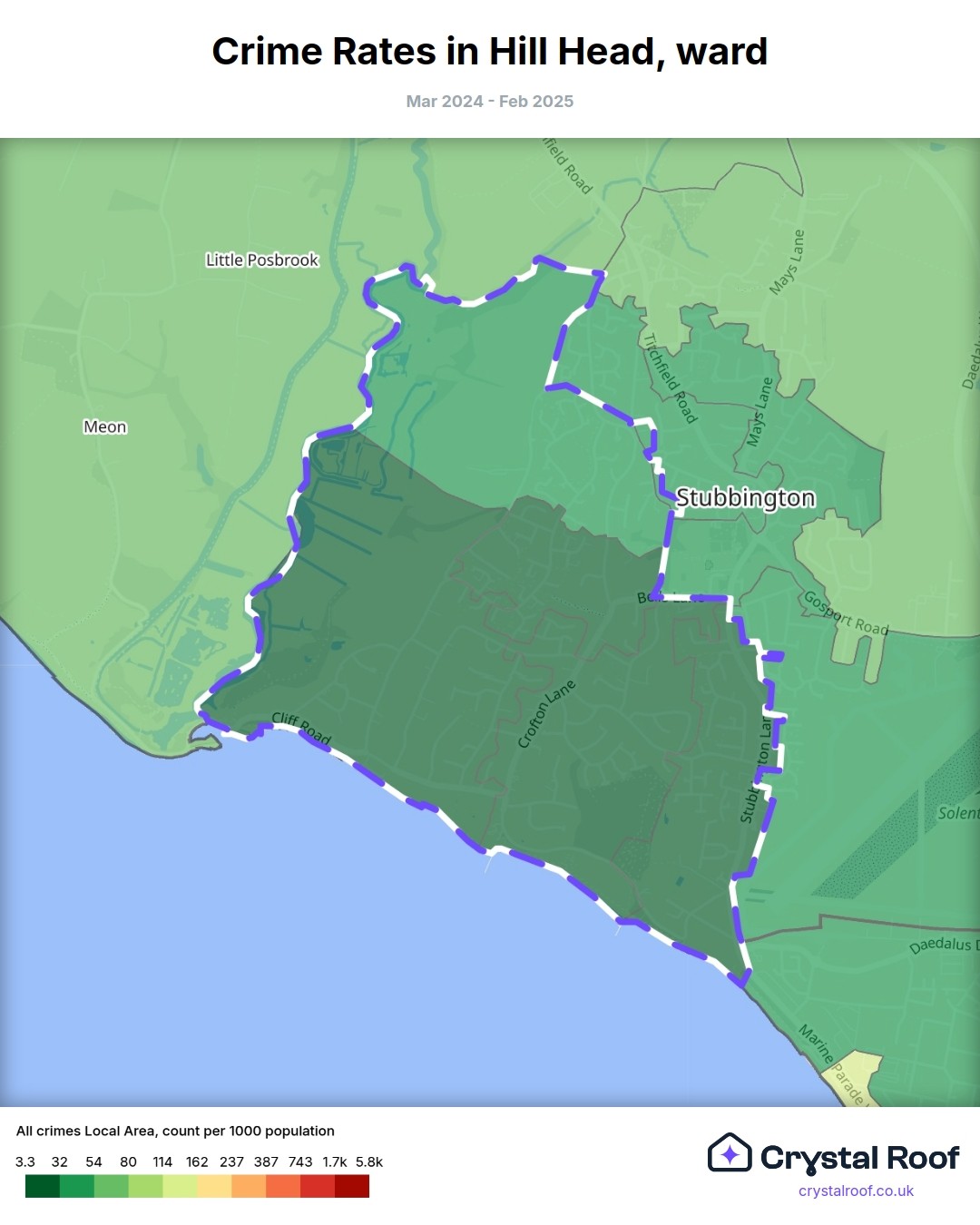 Hill Head, (ward) includes areas with the following crime ratings (see map):