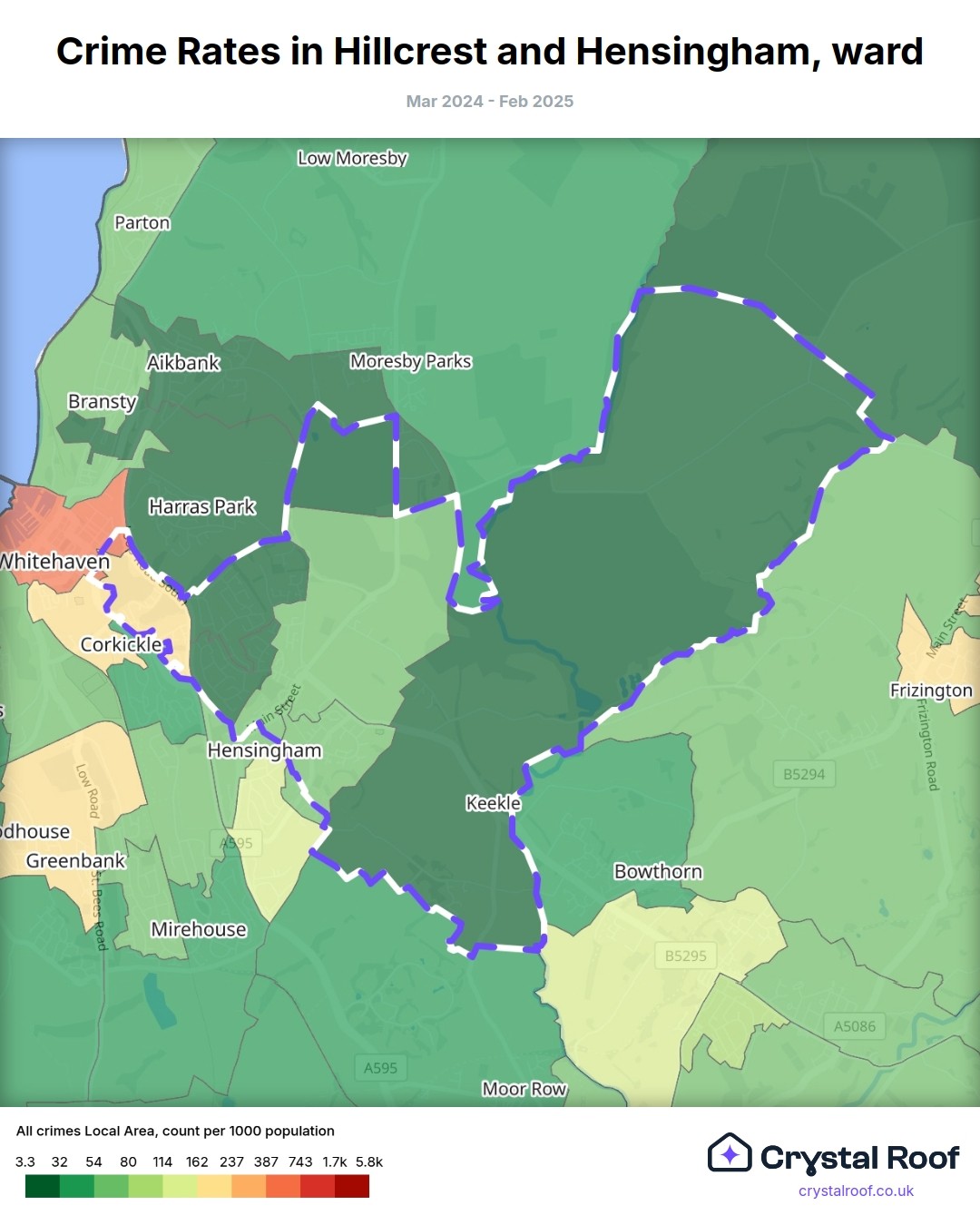 Hillcrest and Hensingham, (ward) includes areas with the following crime ratings (see map):