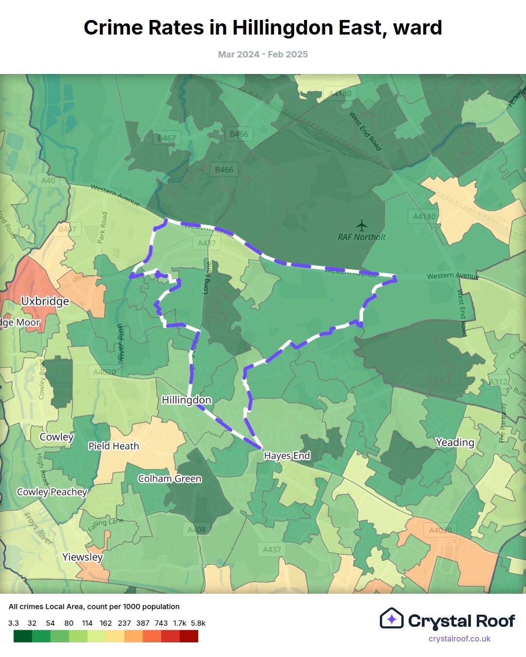 Hillingdon East, (ward) includes areas with the following crime ratings (see map):