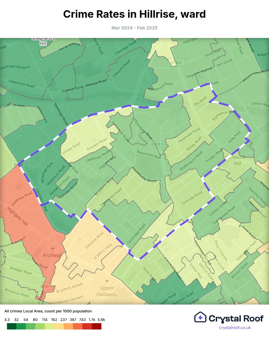Hillrise (ward) is located within Islington (borough). Annual total crime rate in Islington (borough) is 190 crimes per thousand resident population, which can be rated as 8 out of 10 or high crime level compared to other local authority districts in England and Wales.