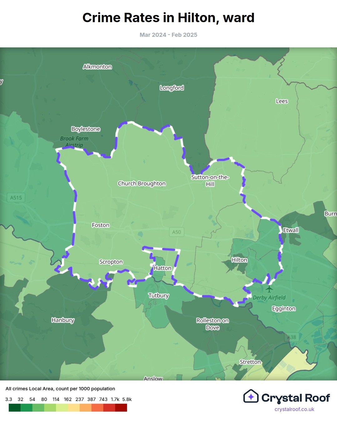 Hilton (ward) is located within South Derbyshire (borough). Annual total crime rate in South Derbyshire (borough) is 70.9 crimes per thousand resident population, which can be rated as 2 out of 10 or low crime level compared to other local authority districts in England and Wales.