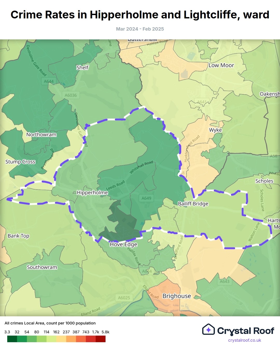 Hipperholme and Lightcliffe, (ward) includes areas with the following crime ratings (see map):