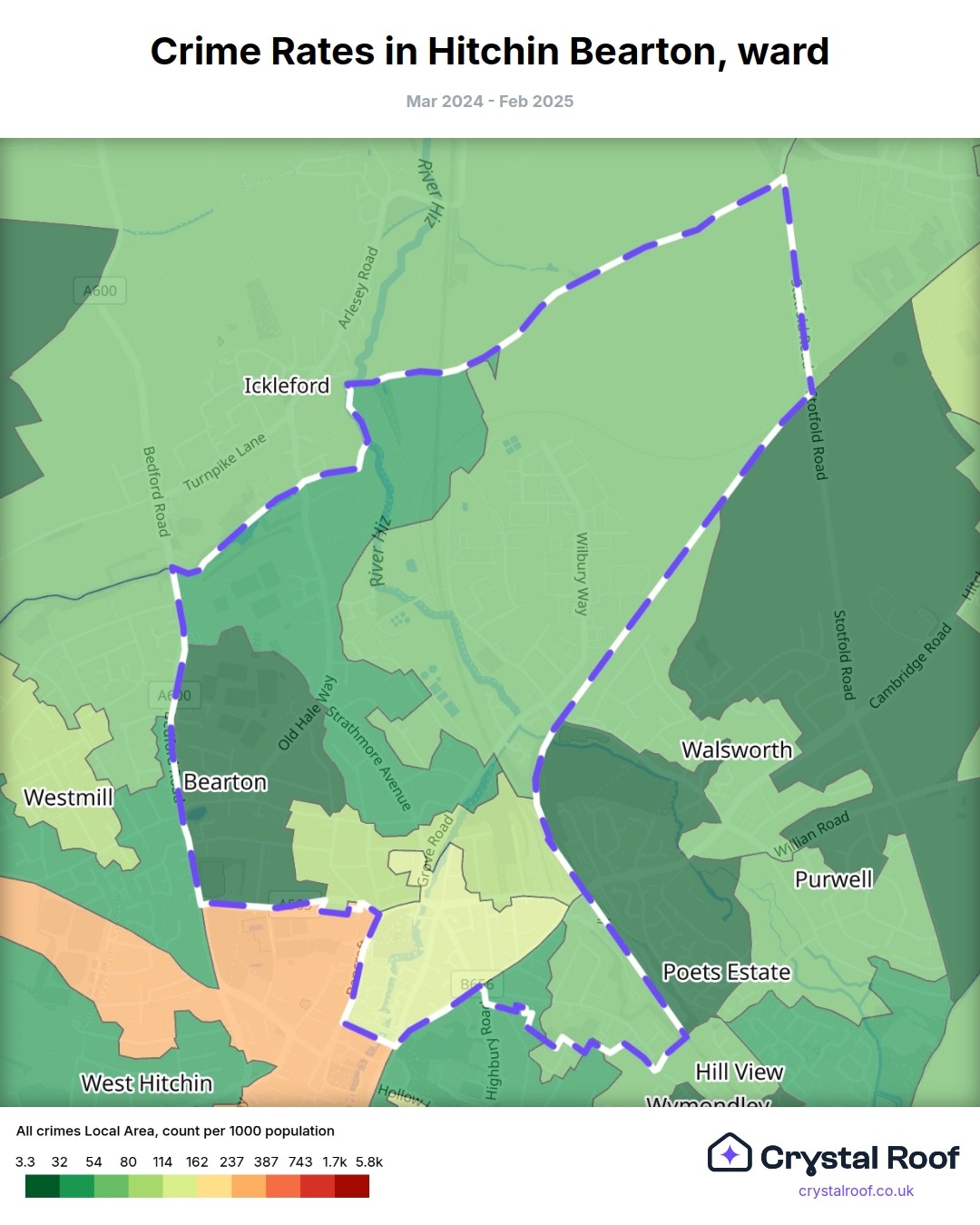 Hitchin Bearton, (ward) includes areas with the following crime ratings (see map):