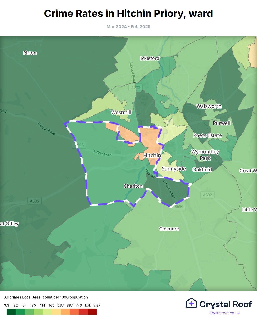 Hitchin Priory, (ward) includes areas with the following crime ratings (see map):