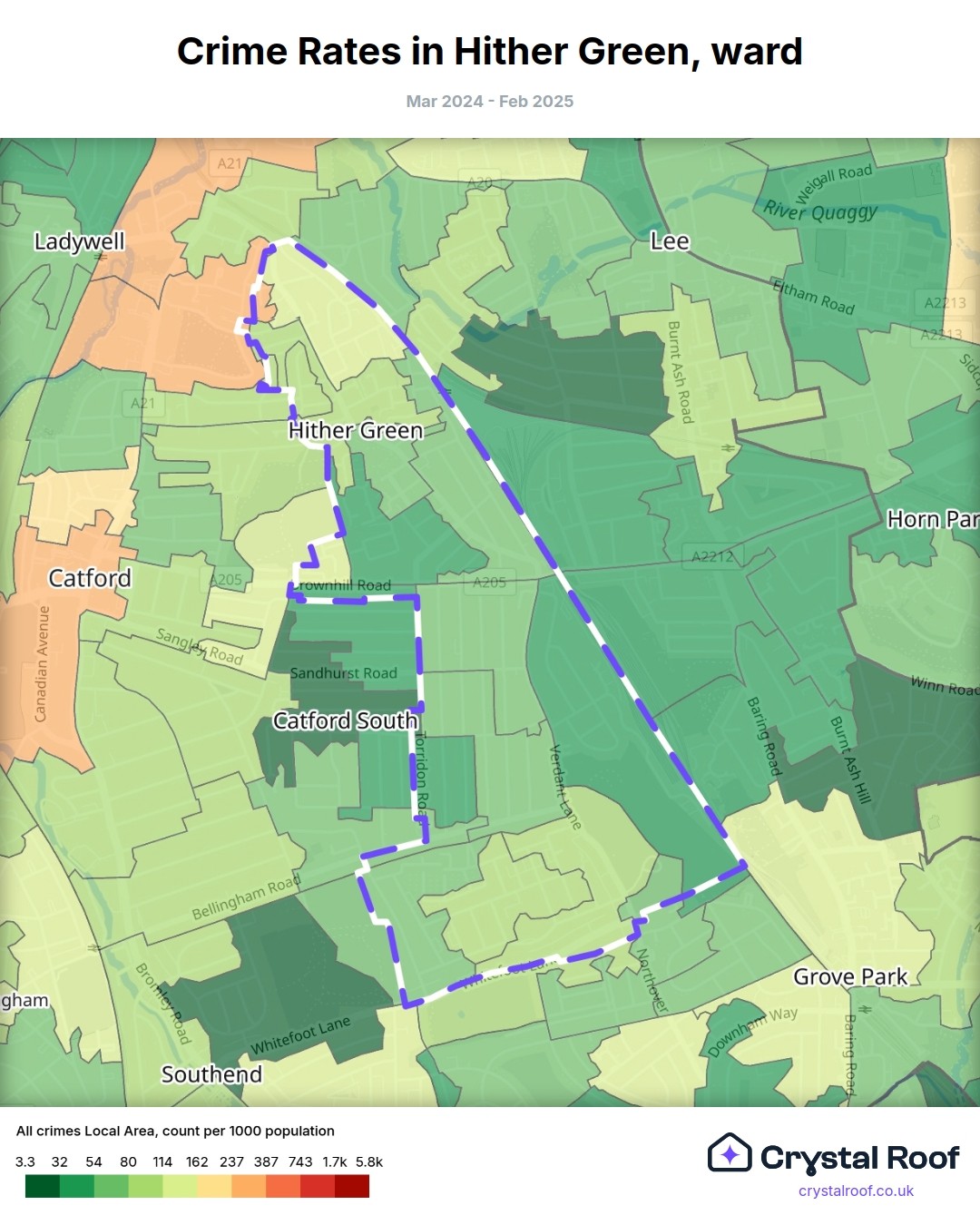 The figures in grey indicate the relative ratings of Hither Green (ward) for a specific crime type compared to other wards in England and Wales.
