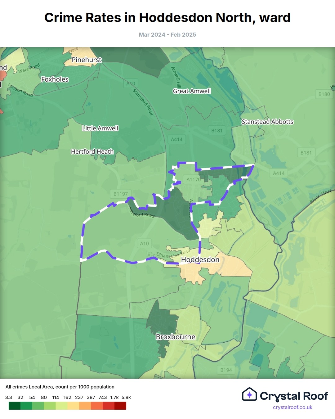 Hoddesdon North, (ward) includes areas with the following crime ratings (see map):