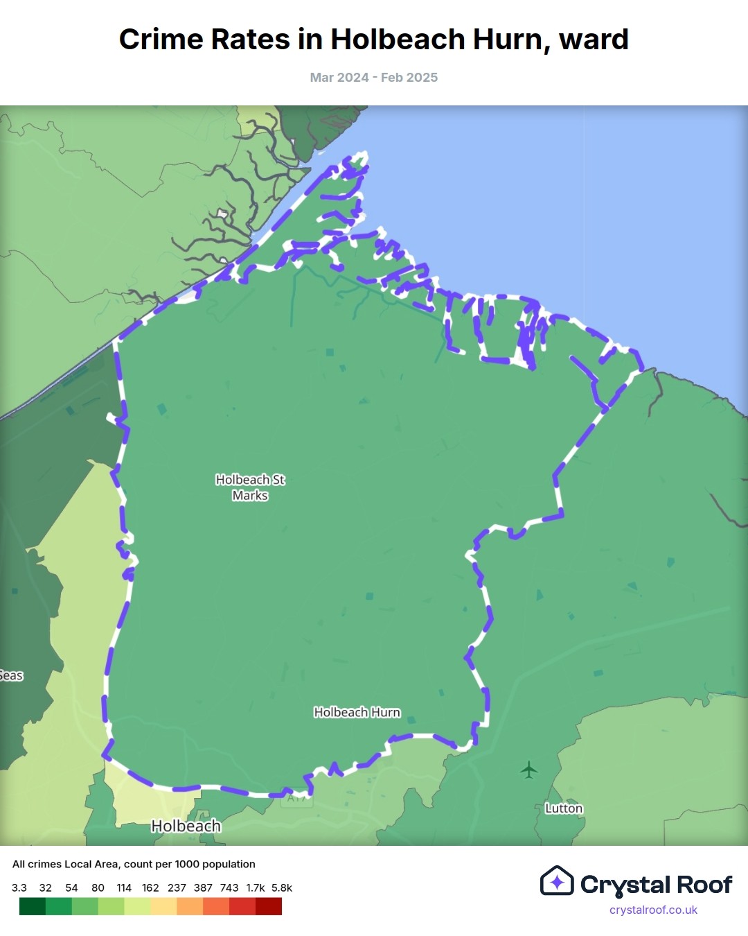 The figures in grey indicate the relative ratings of Holbeach Hurn (ward) for a specific crime type compared to other wards in England and Wales.
