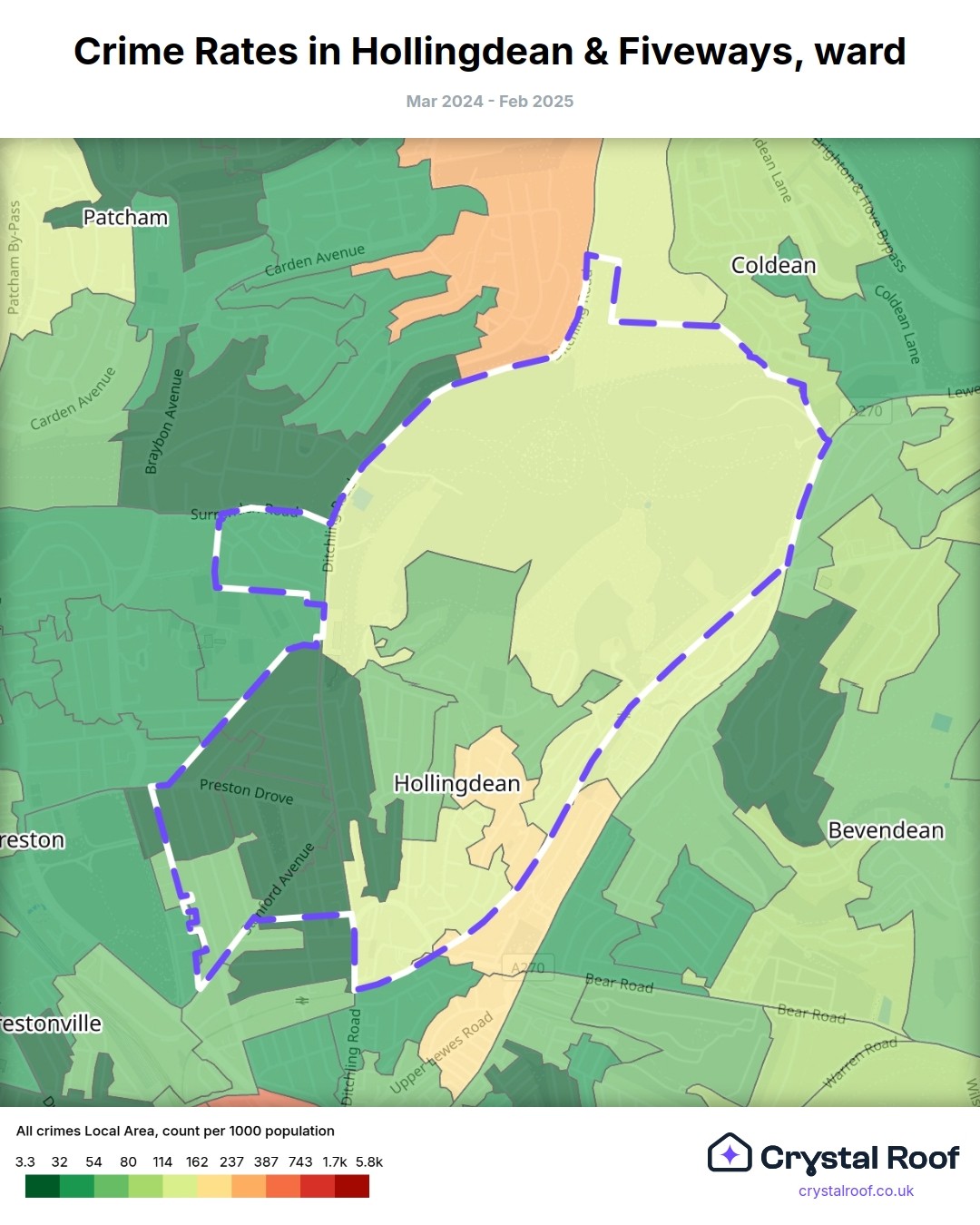 Hollingdean & Fiveways, (ward) includes areas with the following crime ratings (see map):