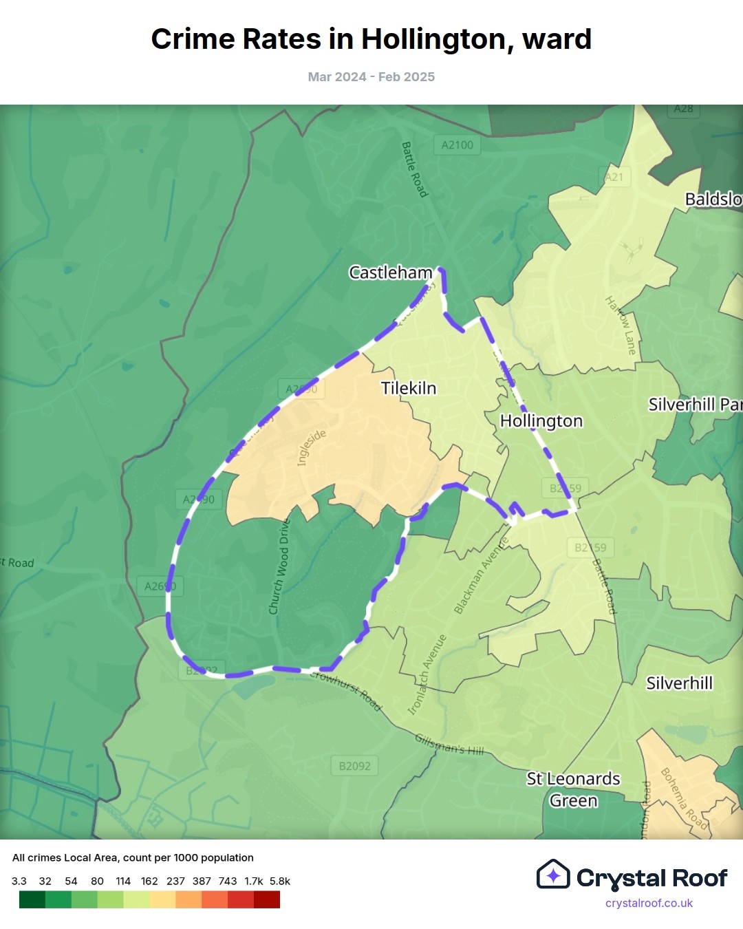 Hollington (ward) is located within Hastings (borough). Annual total crime rate in Hastings (borough) is 115 crimes per thousand resident population, which can be rated as 6 out of 10 or medium crime level compared to other local authority districts in England and Wales.