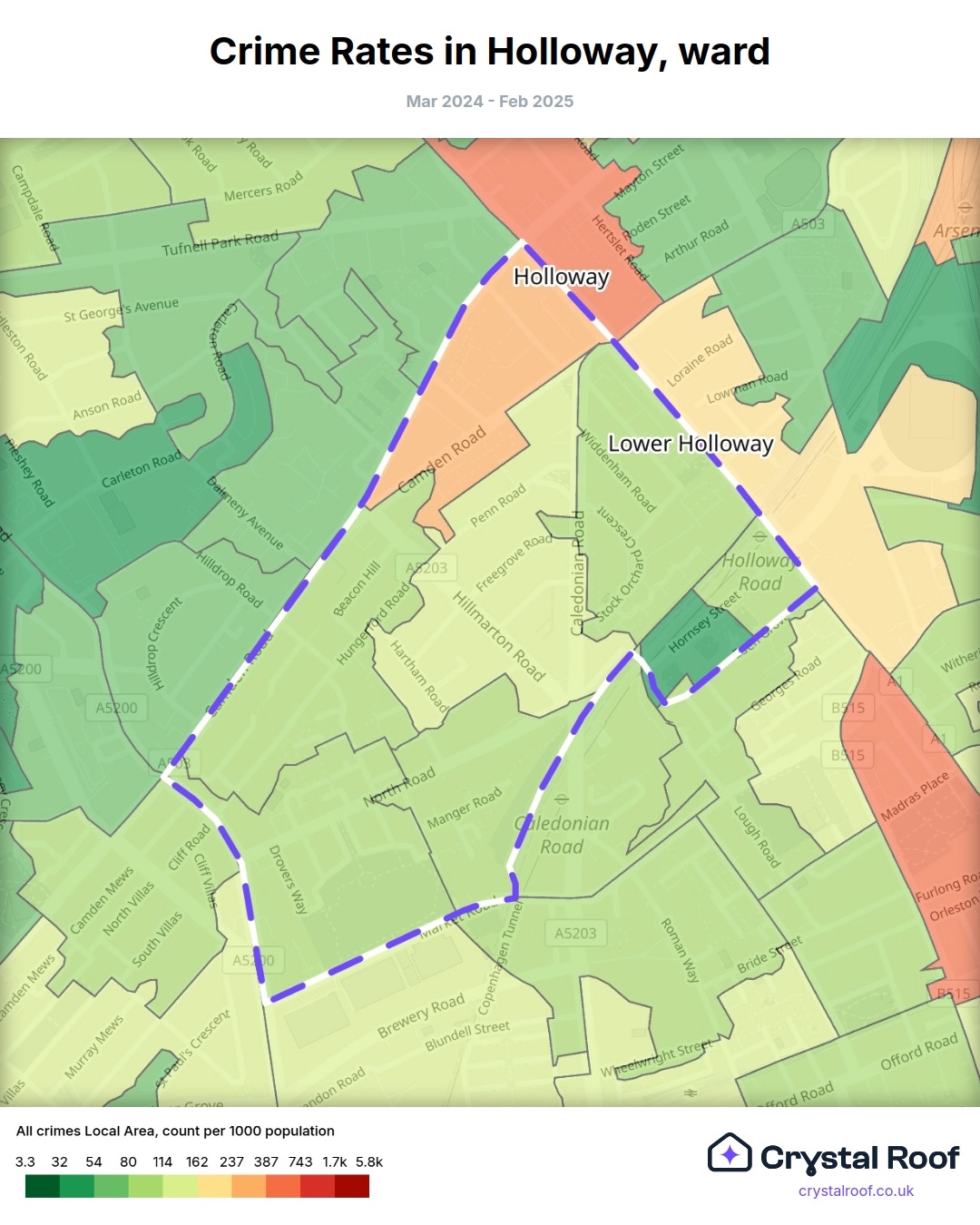 Holloway, (ward) includes areas with the following crime ratings (see map):