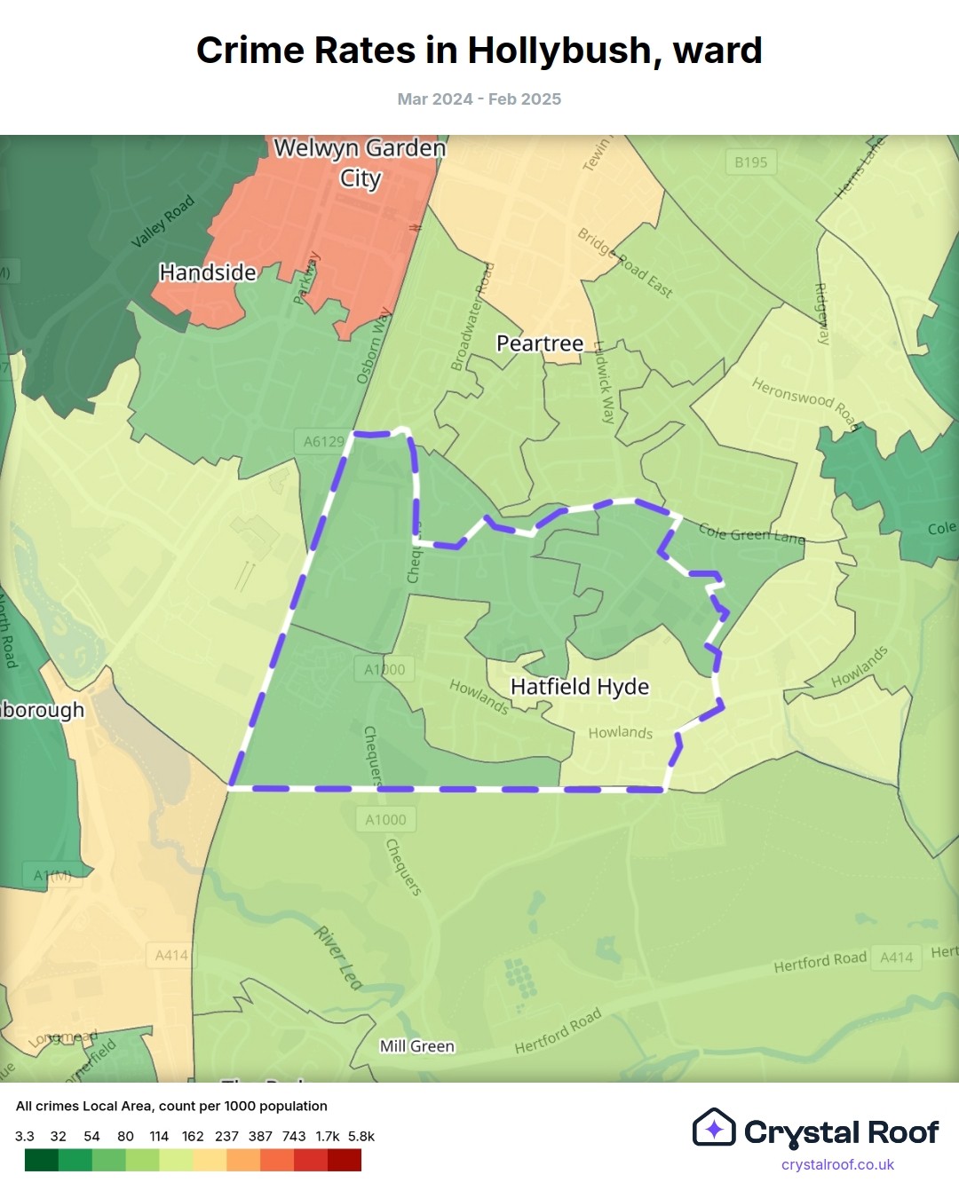Hollybush (ward) is located within Welwyn Hatfield (borough). Annual total crime rate in Welwyn Hatfield (borough) is 103 crimes per thousand resident population, which can be rated as 5 out of 10 or medium crime level compared to other local authority districts in England and Wales.