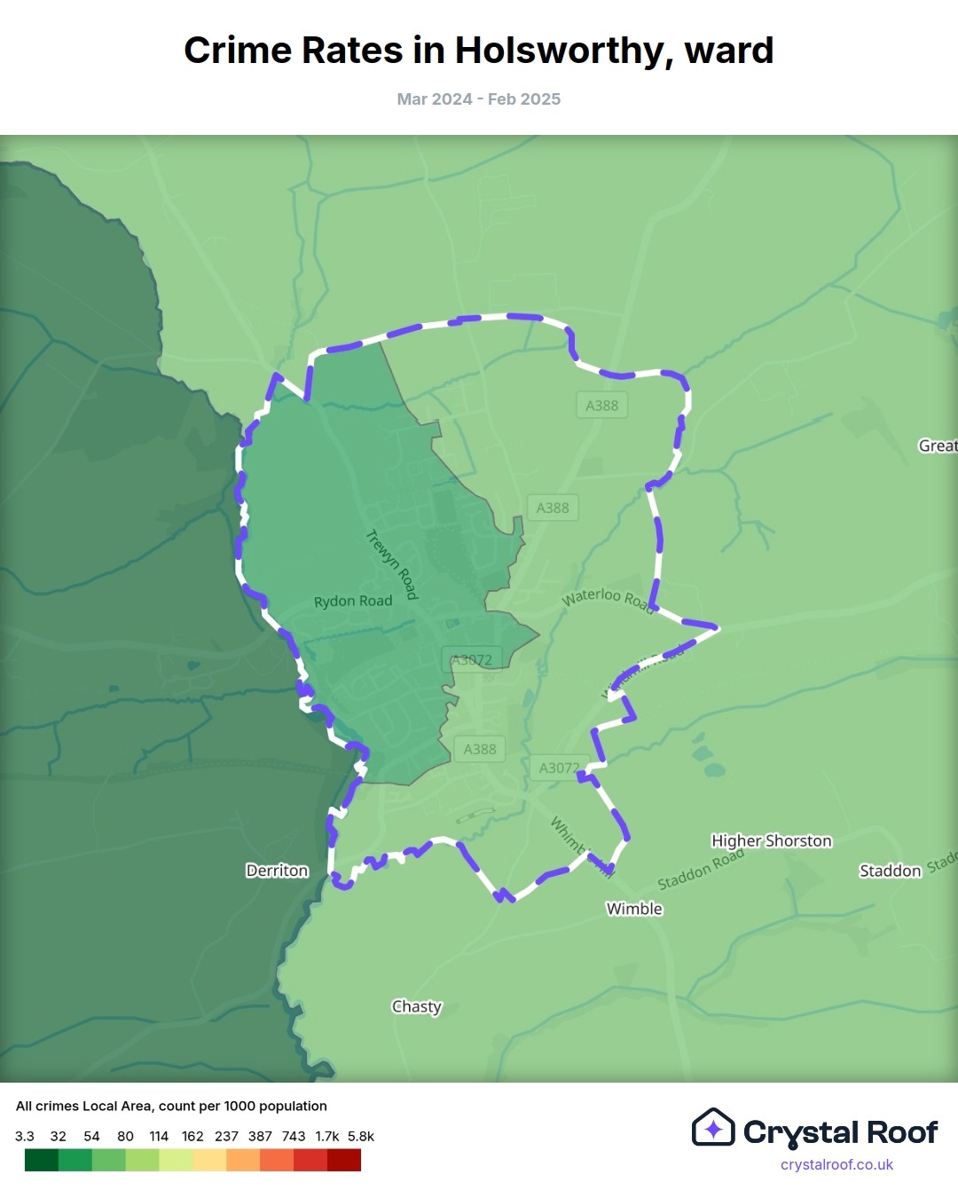 Holsworthy, (ward) includes areas with the following crime ratings (see map):