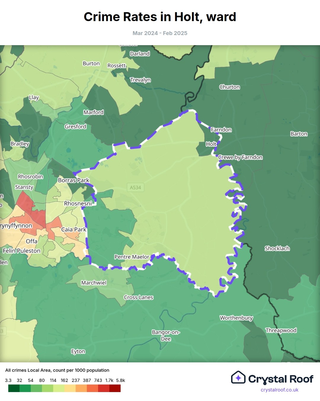 Holt (ward) is located within Wrexham (borough). Annual total crime rate in Wrexham (borough) is 105 crimes per thousand resident population, which can be rated as 5 out of 10 or medium crime level compared to other local authority districts in England and Wales.