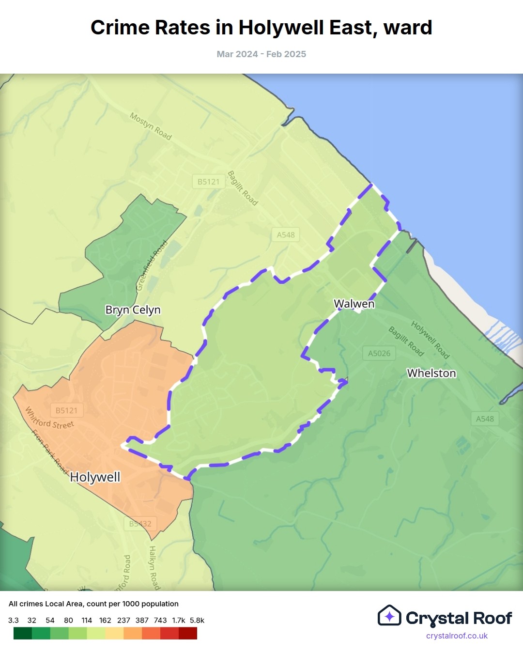 Holywell East, (ward) includes areas with the following crime ratings (see map):