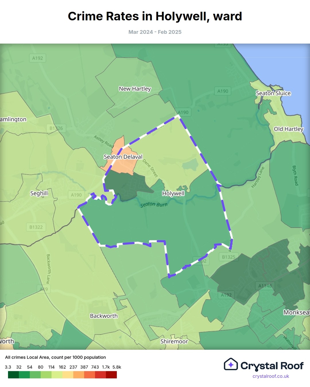 Holywell (ward) is located within Northumberland (borough). Annual total crime rate in Northumberland (borough) is 94.1 crimes per thousand resident population, which can be rated as 4 out of 10 or low crime level compared to other local authority districts in England and Wales.