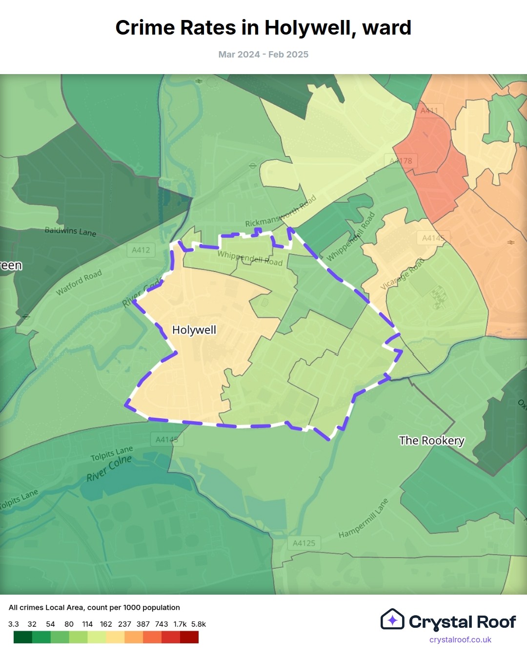 Holywell (ward) is located within Watford (borough). Annual total crime rate in Watford (borough) is 113 crimes per thousand resident population, which can be rated as 5 out of 10 or medium crime level compared to other local authority districts in England and Wales.