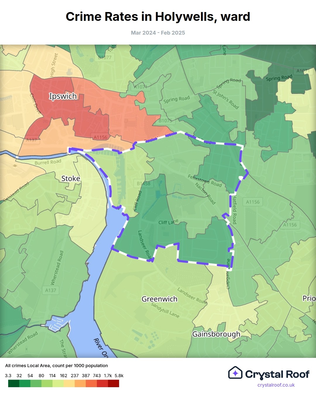 Holywells (ward) is located within Ipswich (borough). Annual total crime rate in Ipswich (borough) is 96.1 crimes per thousand resident population, which can be rated as 4 out of 10 or low crime level compared to other local authority districts in England and Wales.
