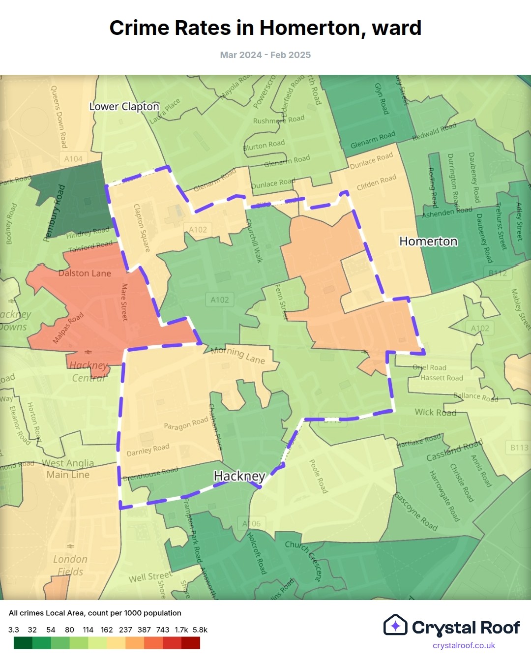 Homerton, (ward) includes areas with the following crime ratings (see map):