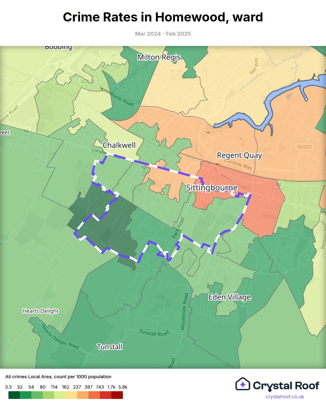 Homewood (ward) is located within Swale (borough). Annual total crime rate in Swale (borough) is 107 crimes per thousand resident population, which can be rated as 5 out of 10 or medium crime level compared to other local authority districts in England and Wales.