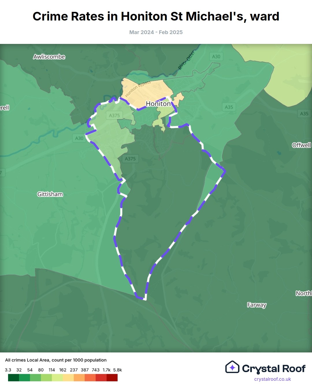 Honiton St Michael's, (ward) includes areas with the following crime ratings (see map):