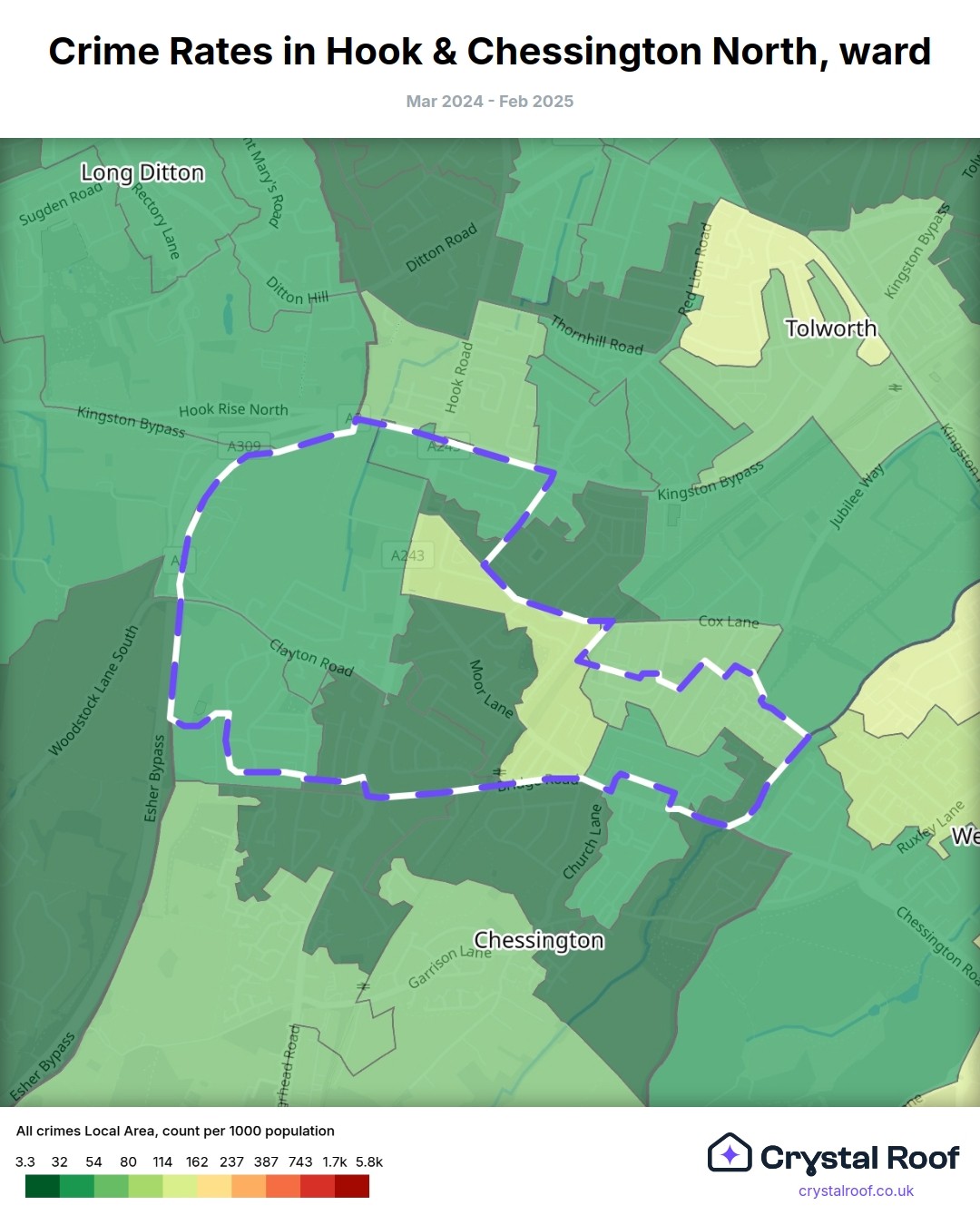Hook & Chessington North, (ward) includes areas with the following crime ratings (see map):