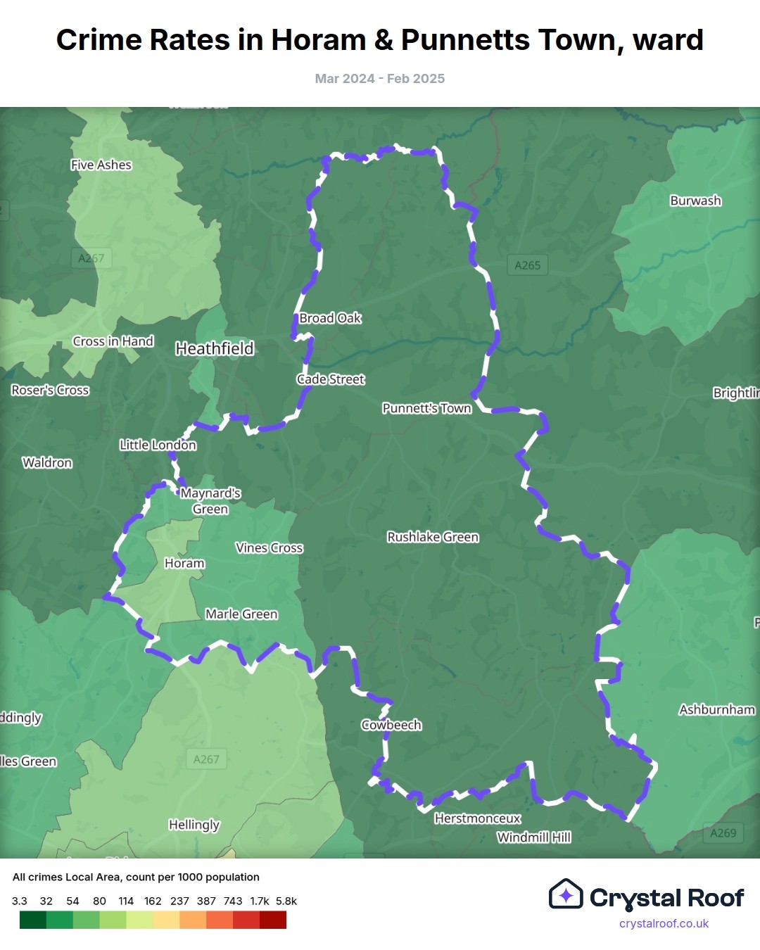 Horam & Punnetts Town, (ward) includes areas with the following crime ratings (see map):